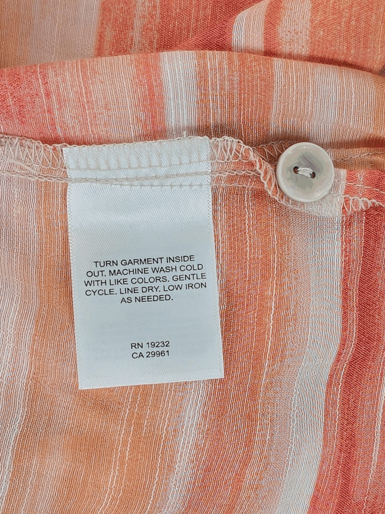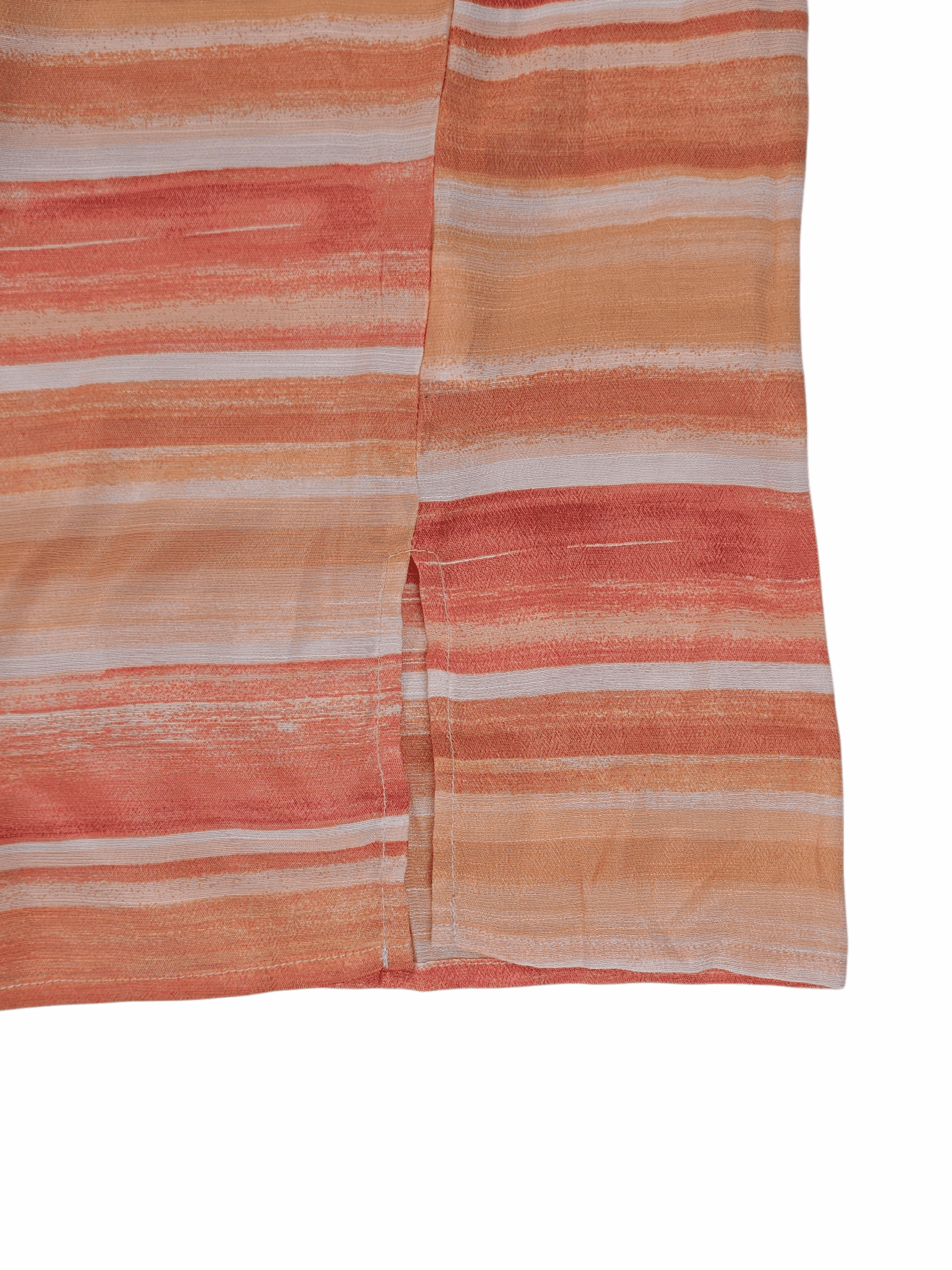 Side slits allow easy motion at the hip. Lightweight woven fabric lets the top breathe well for daily wear. This pumpkin shade top pairs well with denim or dress pants for casual or polished outfits. The material feels smooth, and the silhouette flatters without clinging. It is machine washable and in gently used condition.