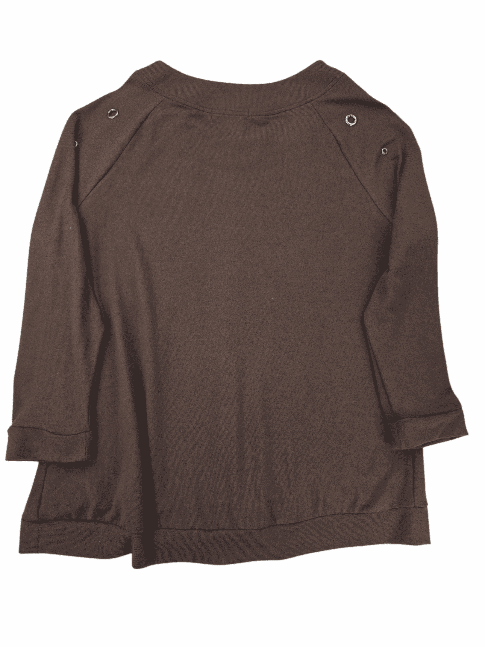 Always Indigo women’s 2X brown knit sweater with gold grommets, zip shoulder accents, and raglan sleeves. Always ships free from Curve Love Revival.