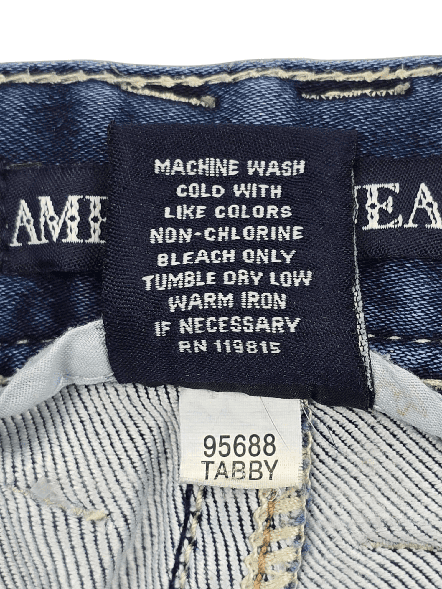 The back pockets show off extra detail with decorative stitching and shine. Additionally, a leather logo label above the right pocket adds a signature touch. Ivory and tan contrast stitching runs throughout the jeans, creating a balanced, finished look. Meanwhile, the unique belt loops—two in the center back and two on each side—add a distinct designer flair.