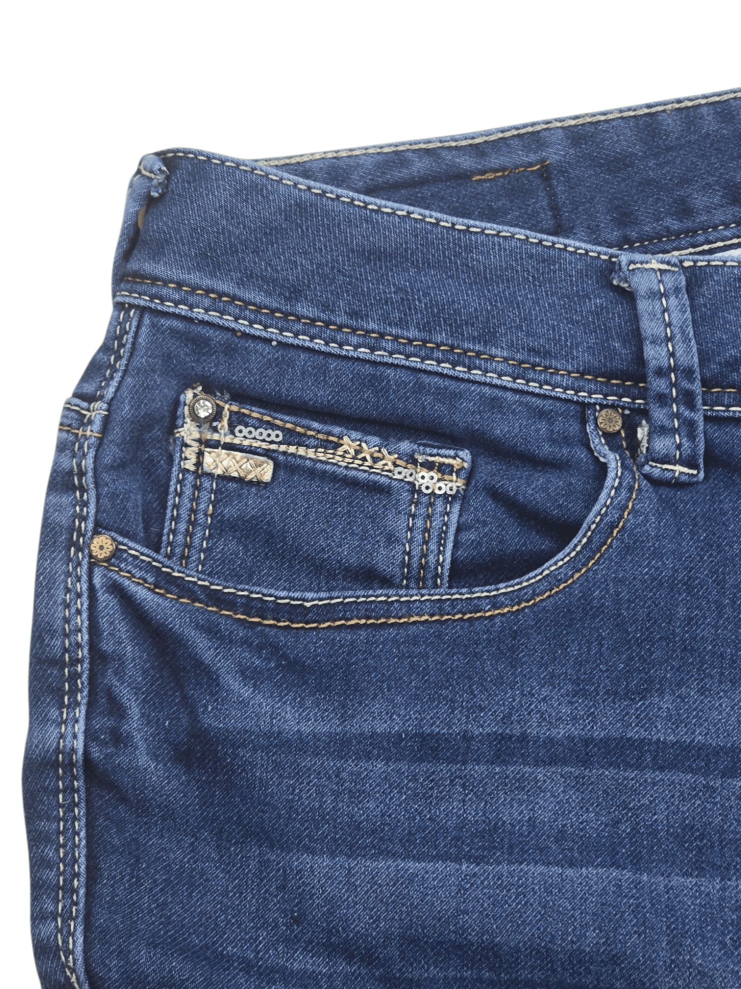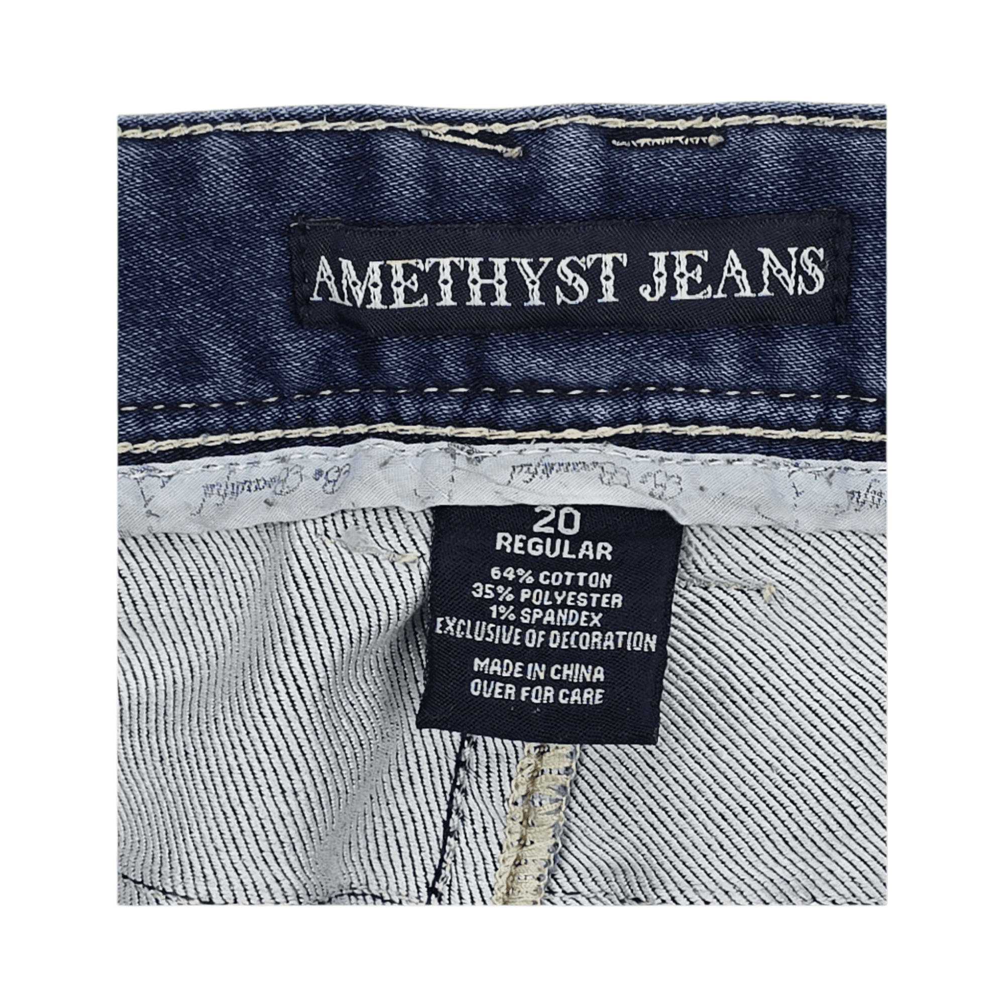These Amethyst women’s size 20 regular jeans bring a mix of classic denim and eye-catching style. Styled in deep blue with a straight-leg cut, they include a traditional zip and branded button closure for a secure, comfortable fit. The five-pocket design features brown and gold stitching, sequins, and rhinestone-style accents that sparkle with every step.