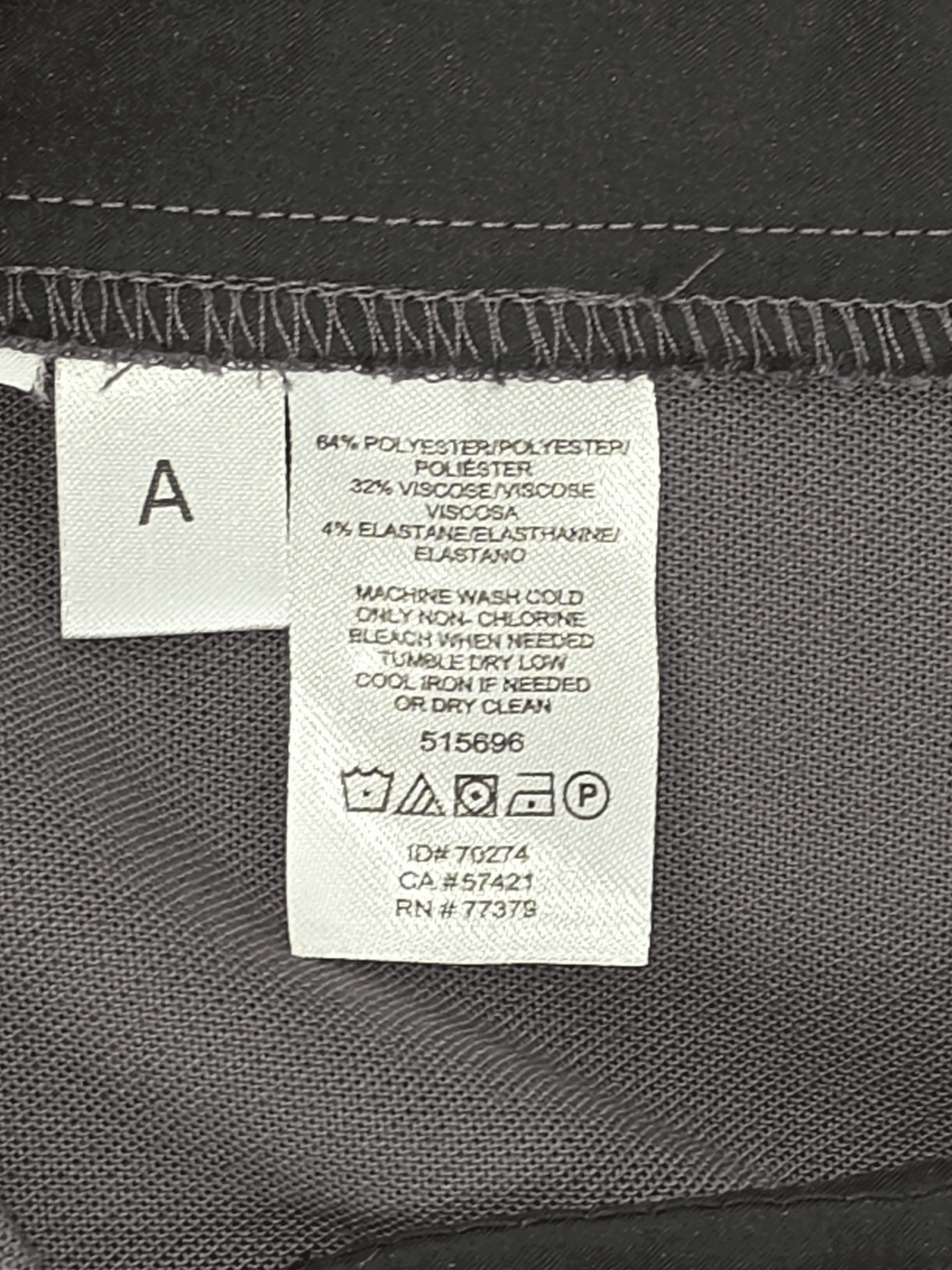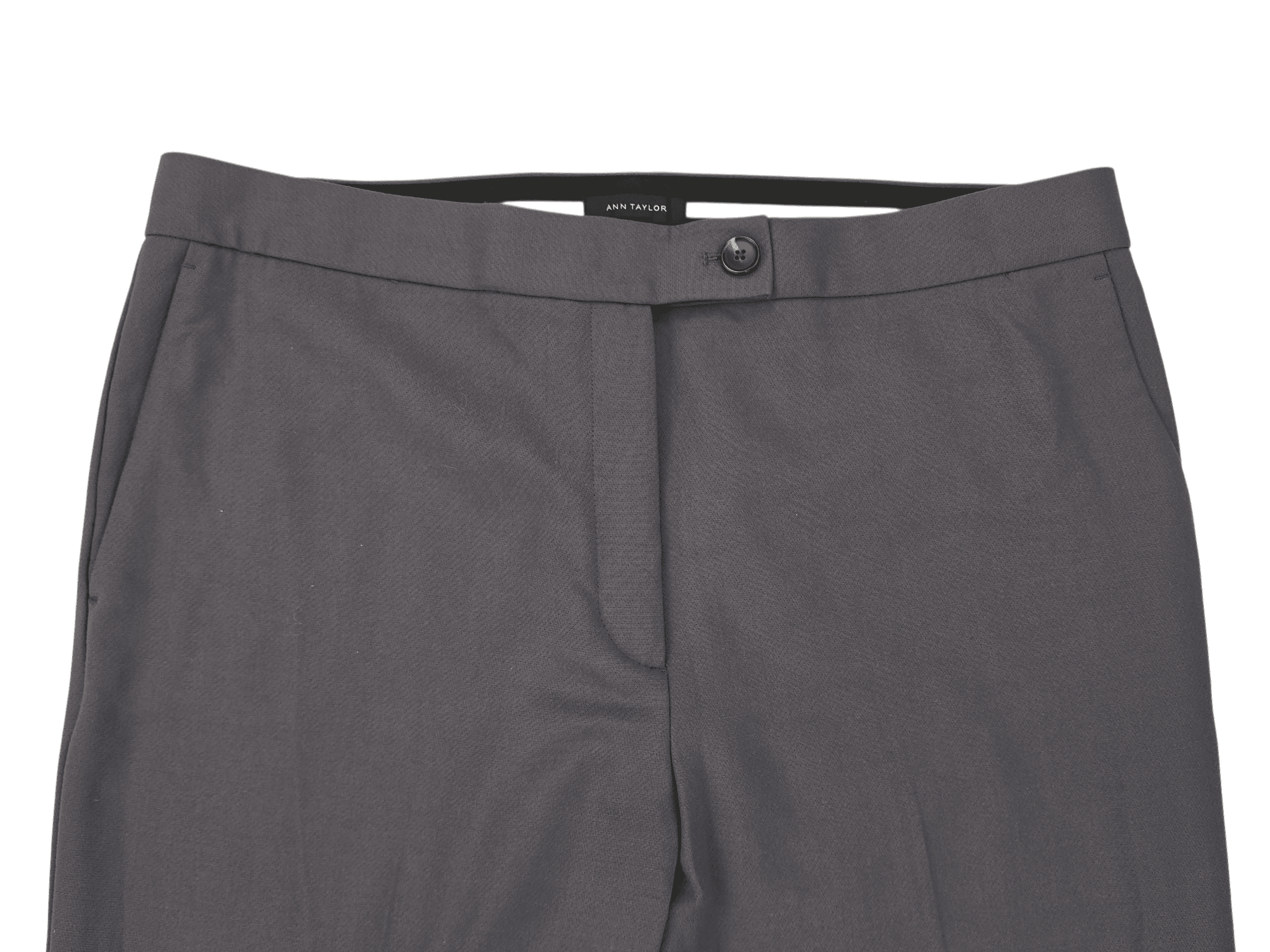 The front features a zipper, an interior button, and an exterior button for a stable fit. Two front slash pockets add function. The back pockets remain sealed for a neat shape. However, you can open them if you prefer. The soft blend of polyester, viscose, and elastane feels flexible and comfortable. These Ann Taylor slacks, with their gray straight-leg style, are both fashionable and functional.