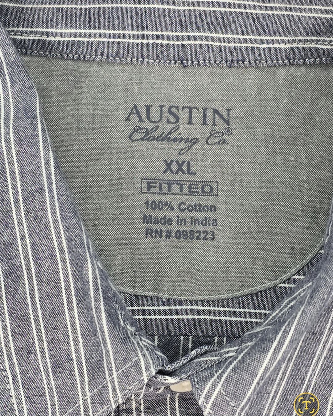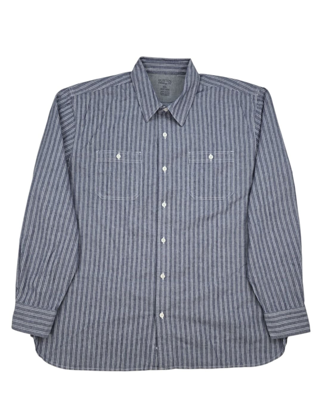 Austin Clothing Company men’s XXL Fitted blue pinstriped cotton button-up shirt with long sleeves, pockets, and relaxed fit.