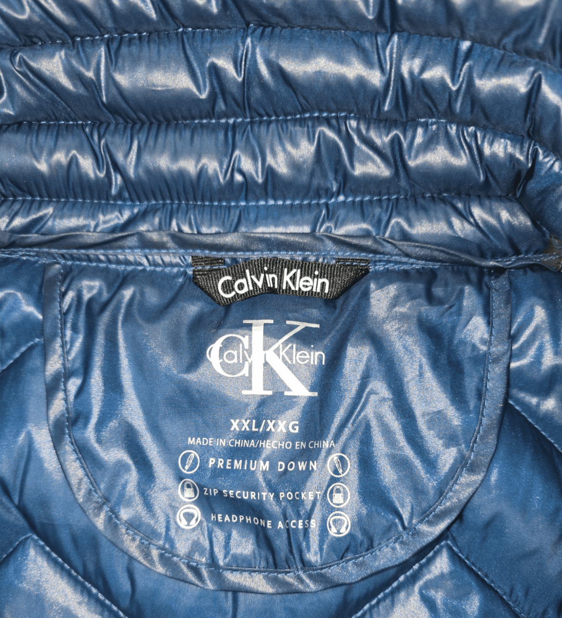 Calvin Klein blue down quilted vest, size XXL. Lightweight warmth, full-zip front, inner and outer pockets.