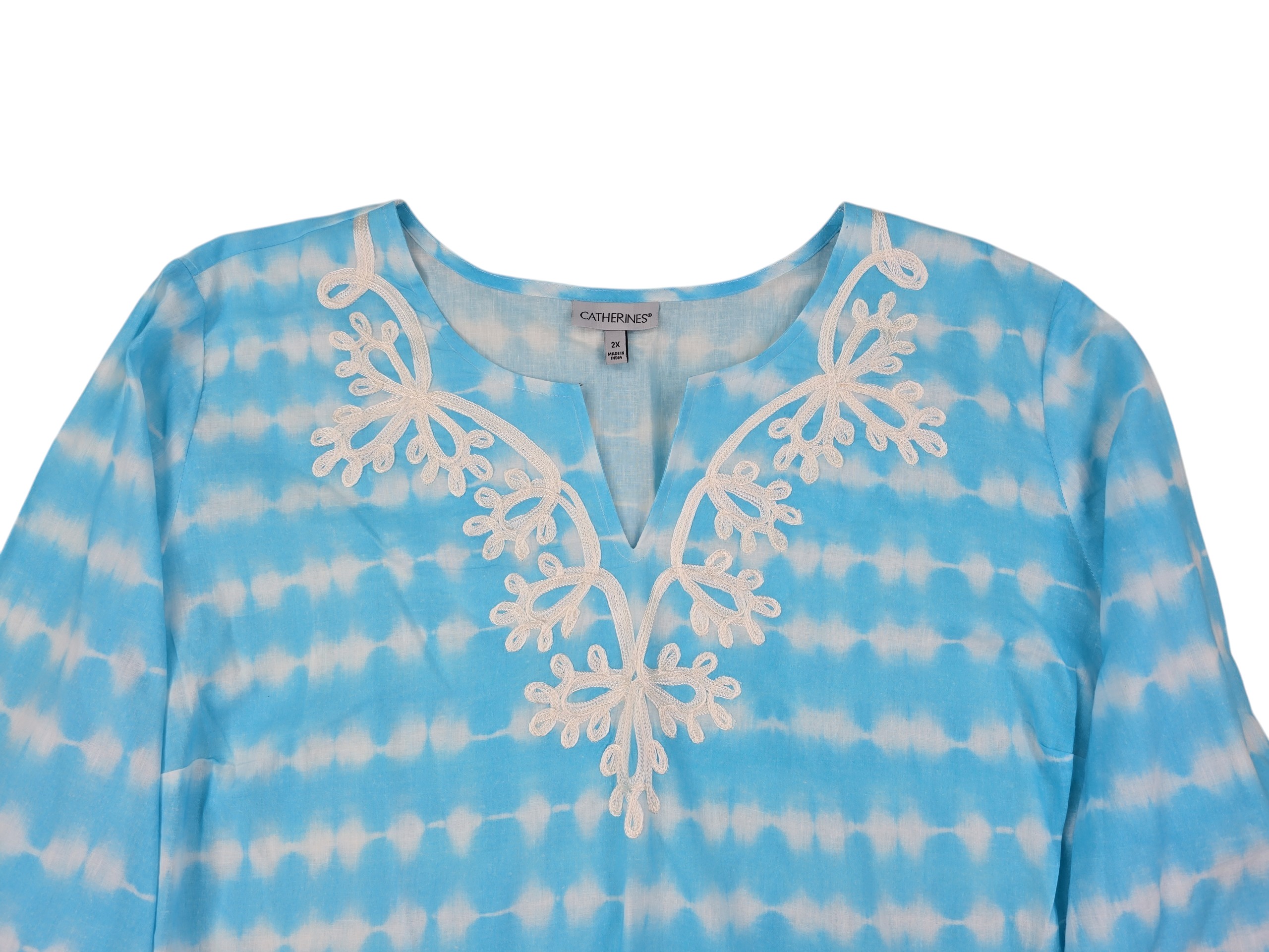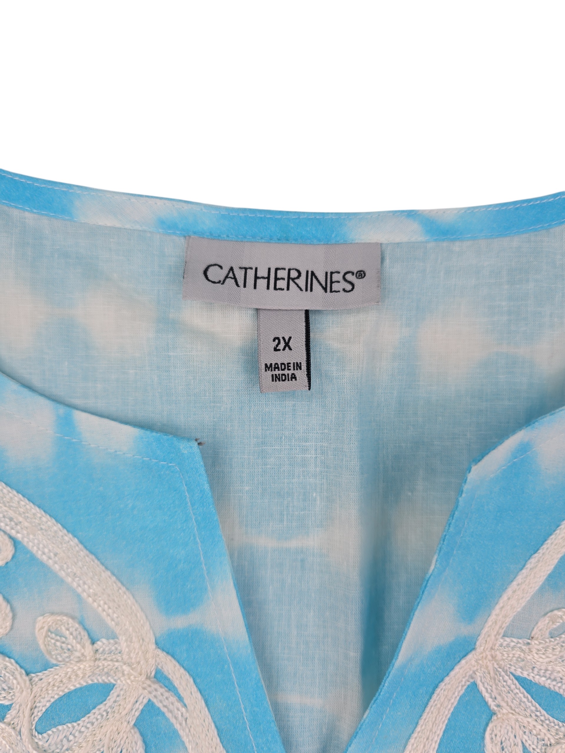 Enjoy easy comfort and breezy style with this 2X Catherines blue tie dye blouse featuring a white embroidered neckline and breathable cotton fabric. Always ships fast and free from Curve Love Revival.