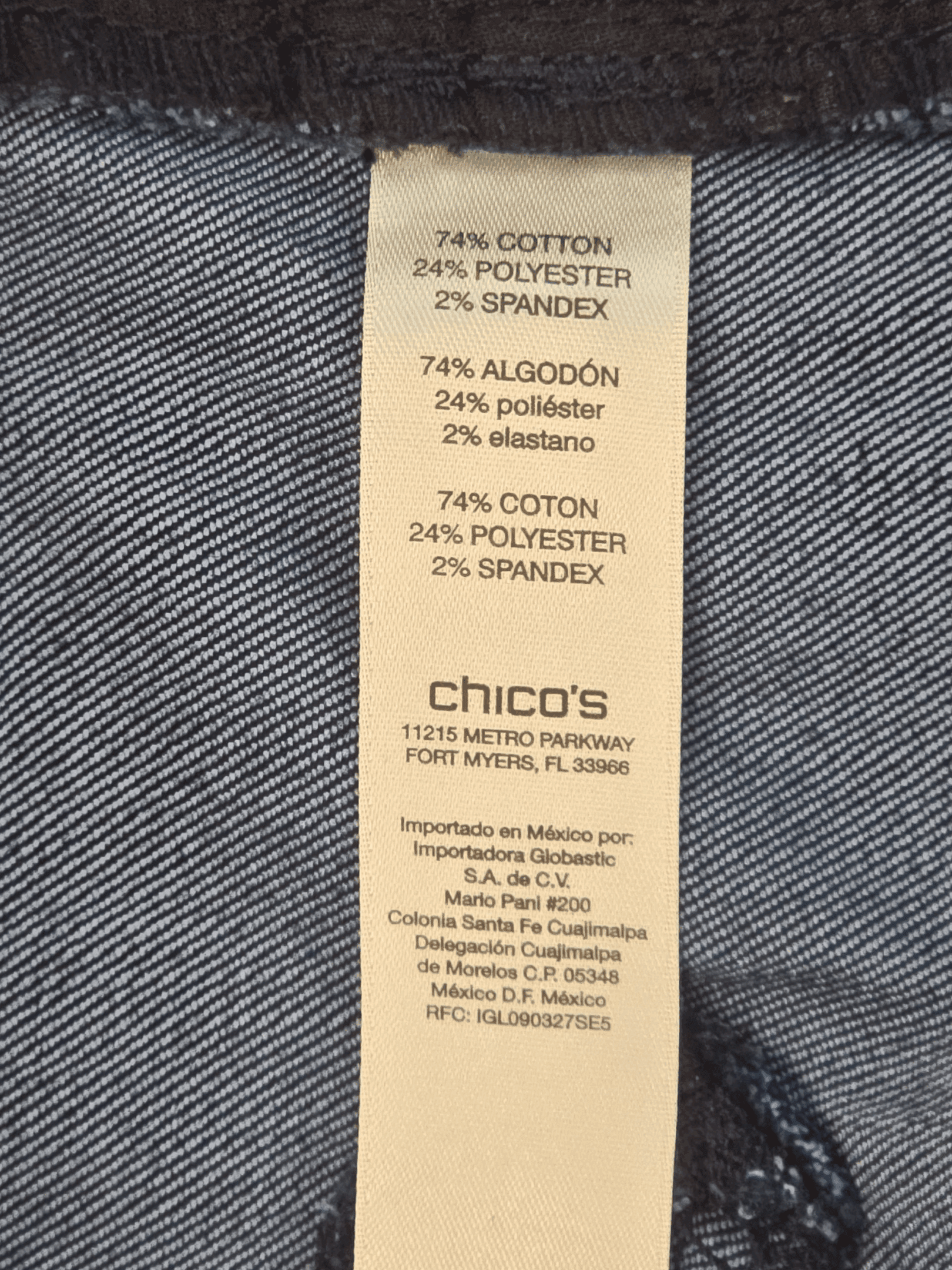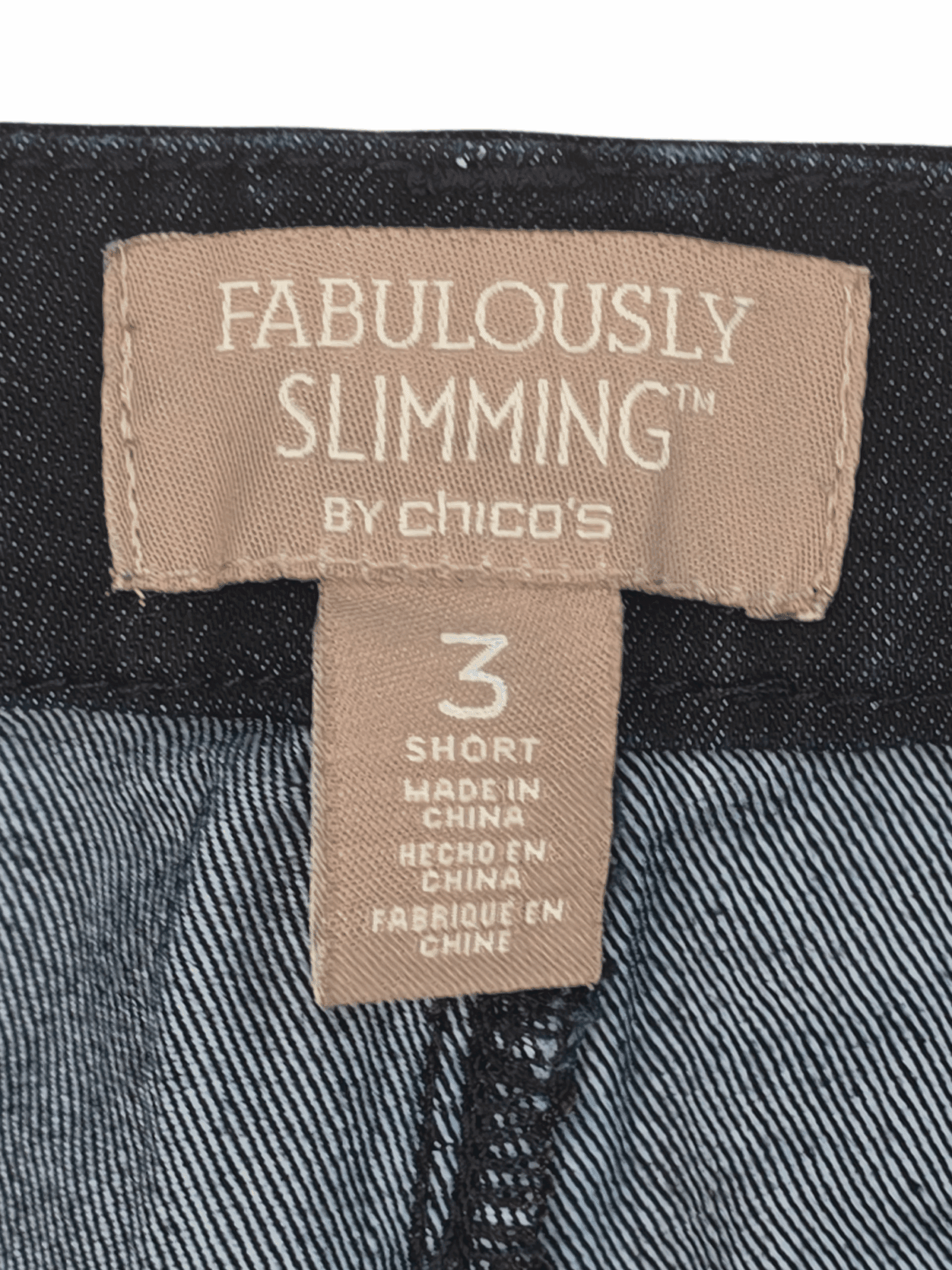 These Chico’s size 3 (which is equivalent to a women’s 16) tummy control jeans offer a flattering, streamlined fit. Also, they provide a soft, comfortable feel. Plus, these Chico’s tummy control jeans provide structure and flexibility that enhances your natural shape. And, these plus size everyday jeans deliver a neat, easy look for versatile styling.