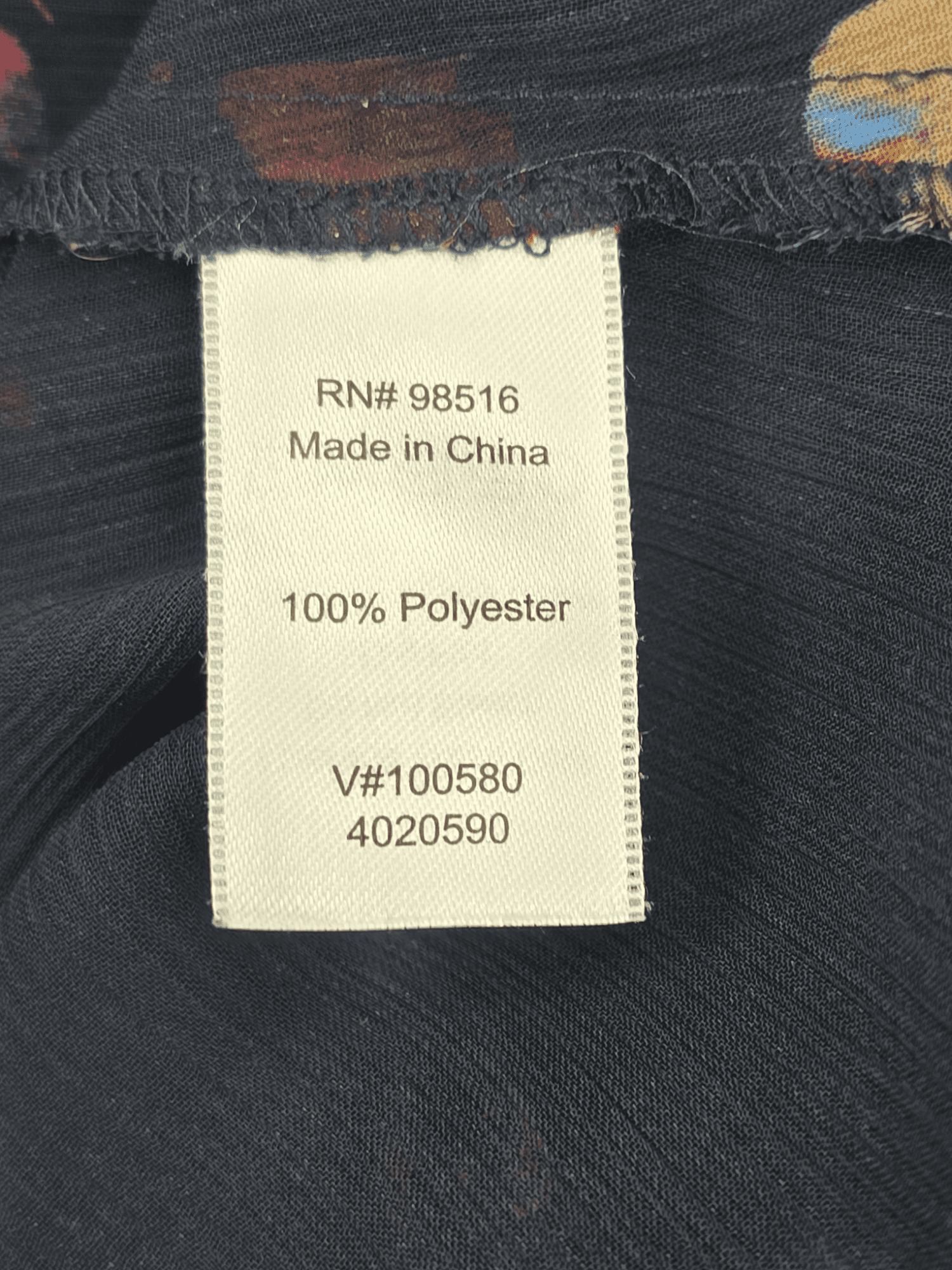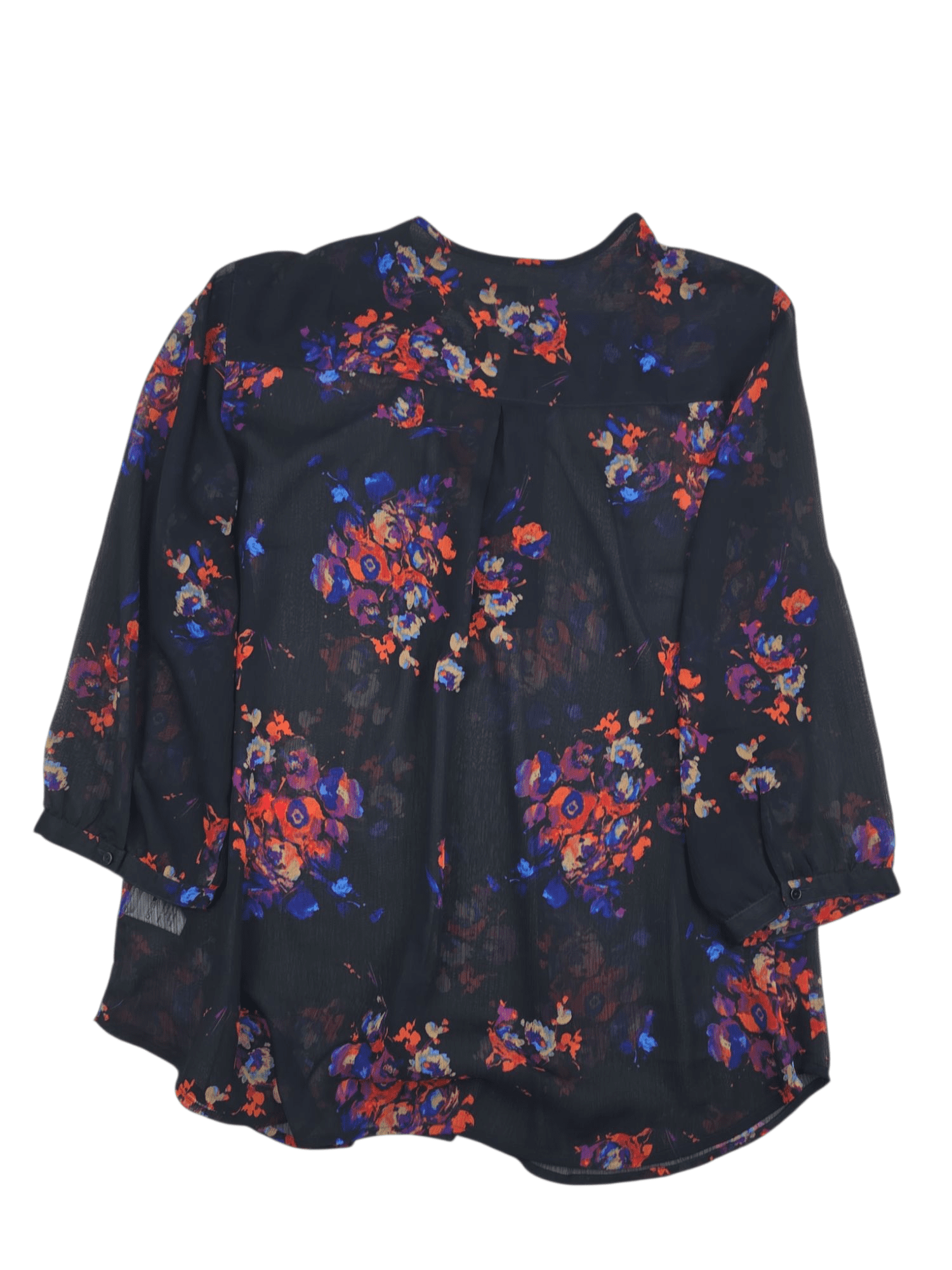 Coldwater Creek women’s size 18 black floral v-neck blouse with buttoned 3/4 sleeves and ribbed neckline inset. Lightweight, machine washable, and gently used.