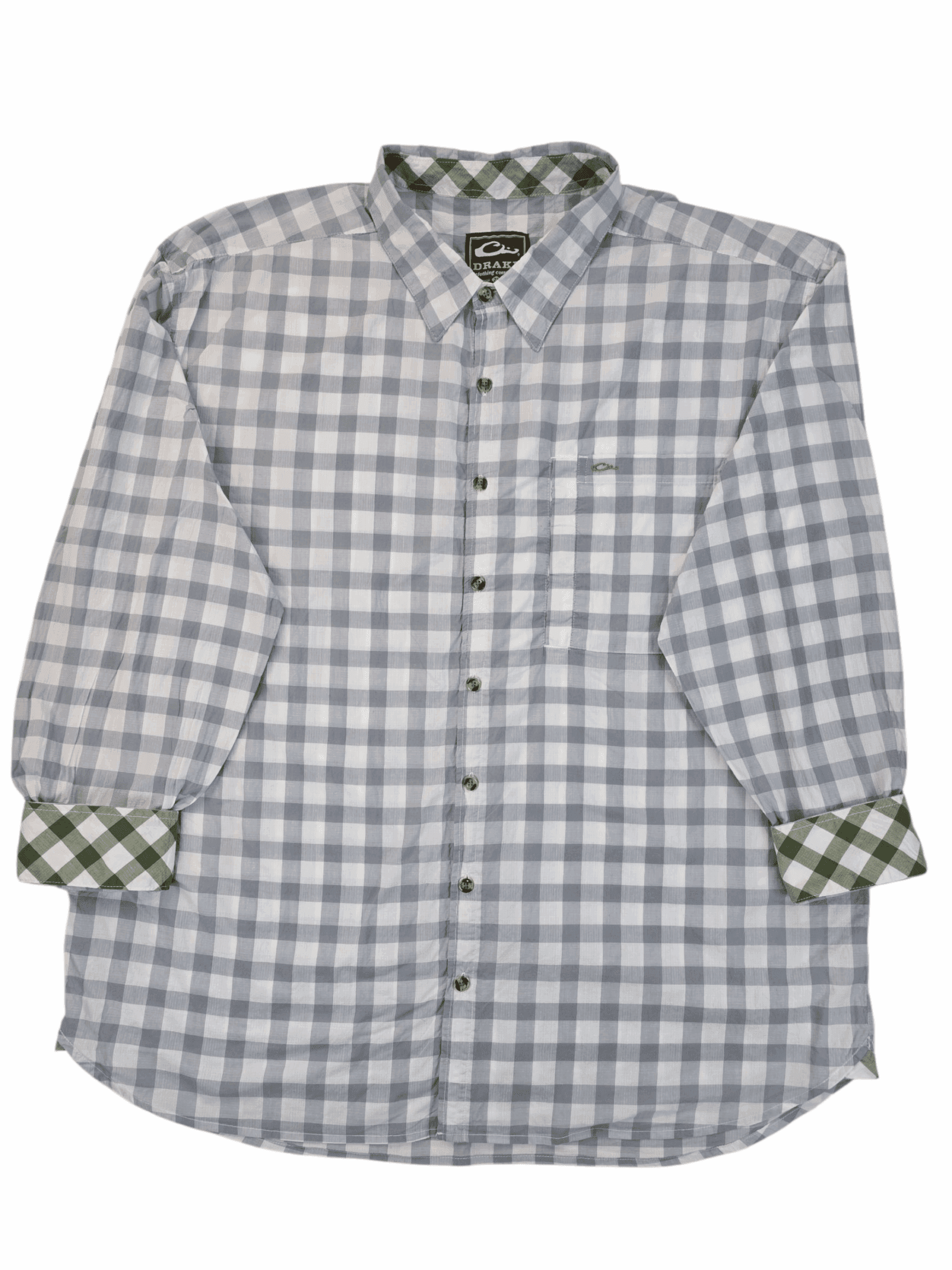 This Drake men’s long sleeve shirt in size 2X delivers rugged reliability with classic everyday style. The gray and white checked pattern pairs easily with casual or outdoor looks. Additionally, this men’s long sleeve button up shirt offers breathable comfort. And, it is made of durable ripstop fabric for lasting wear in any setting.