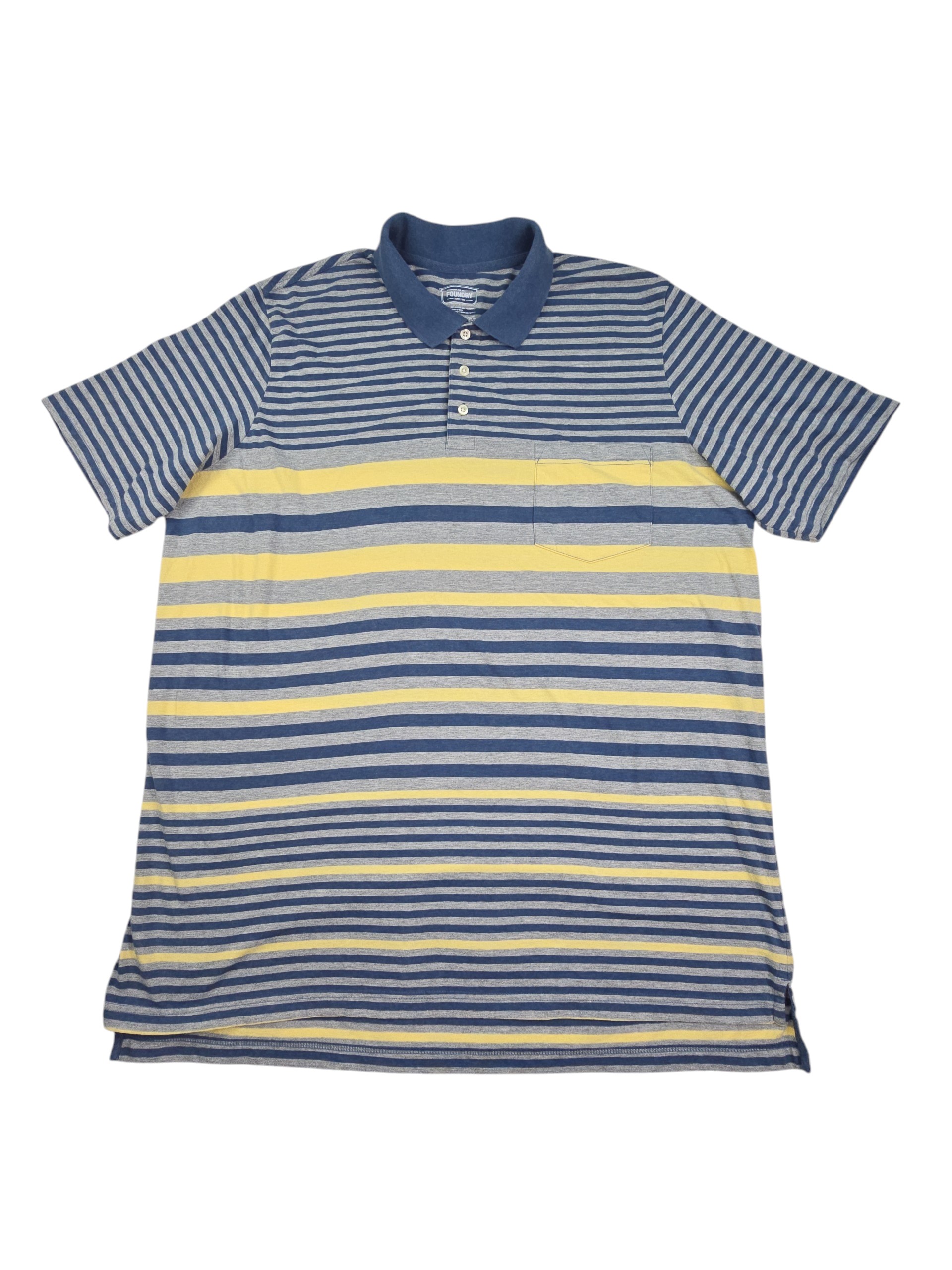 This Foundry short sleeve polo shirt offers a clean, casual look with a mix of blue, gray, and yellow horizontal stripes. This men’s big and tall polo shirt features a soft knit fabric that feels comfortable for all-day wear. The classic design pairs easily with jeans, shorts, or casual pants.