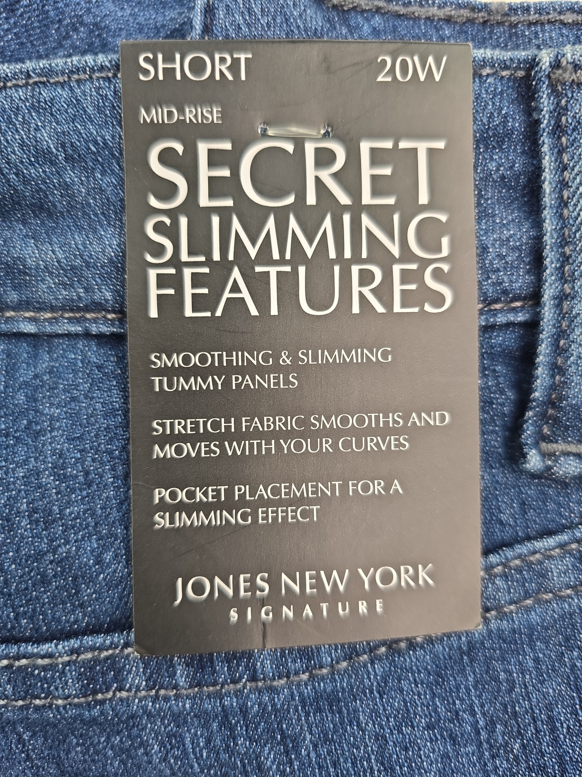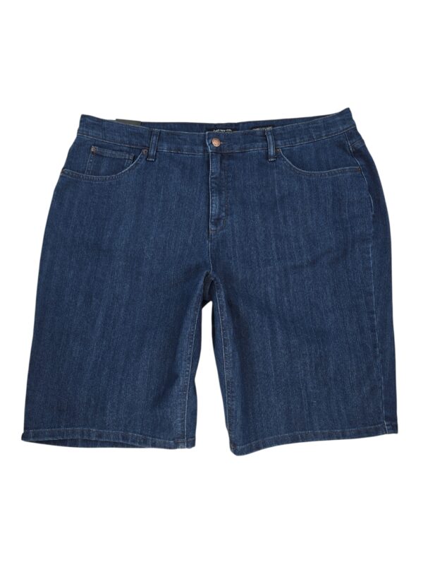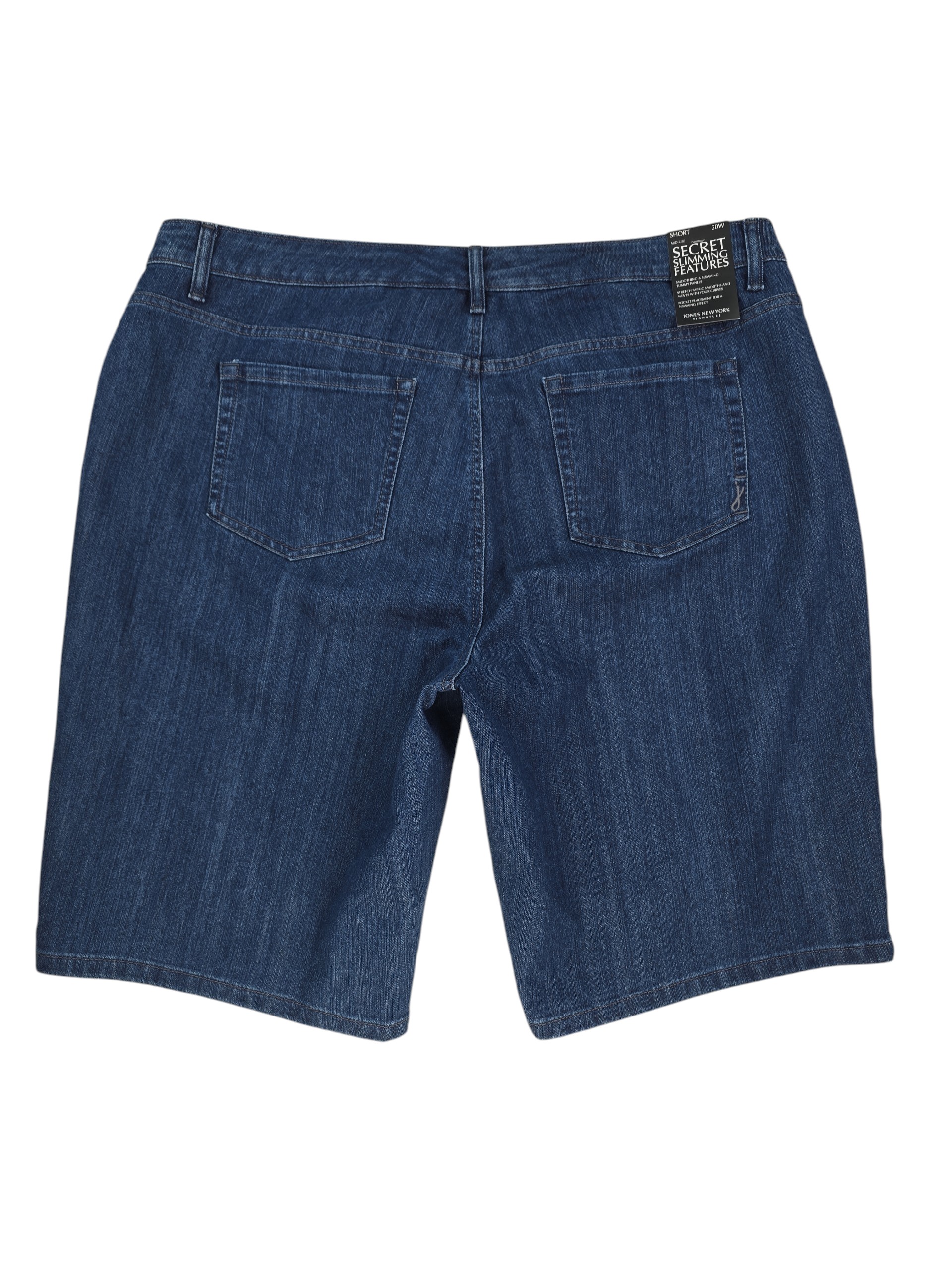 Jones New York denim shorts in size 20W, new with tags, featuring a mid-rise seat-slimming fit, tummy control panel, and stretch denim for smooth comfort. Classic blue wash with five-pocket styling and flattering pocket placement. Ships free from Curve Love Revival.