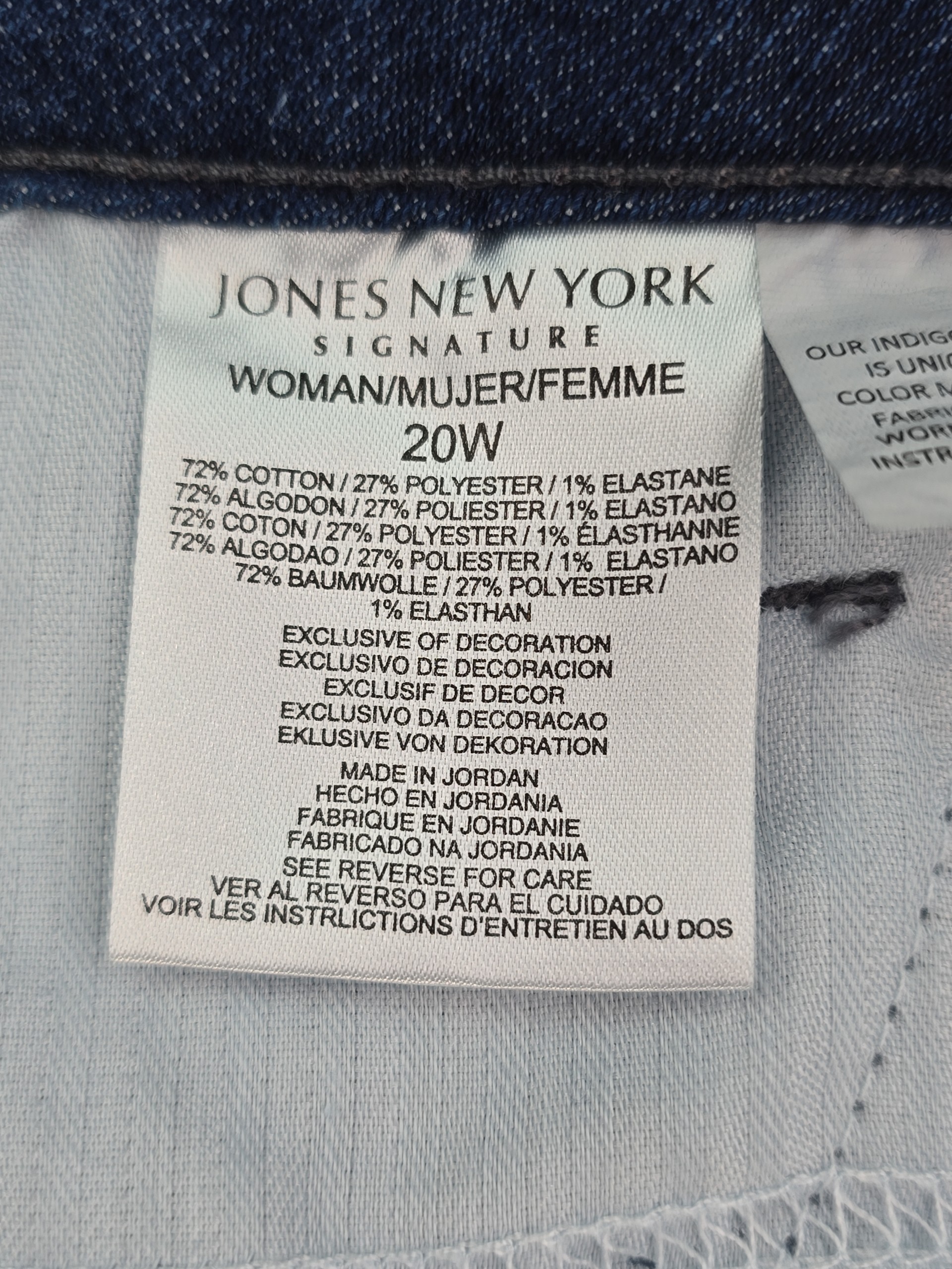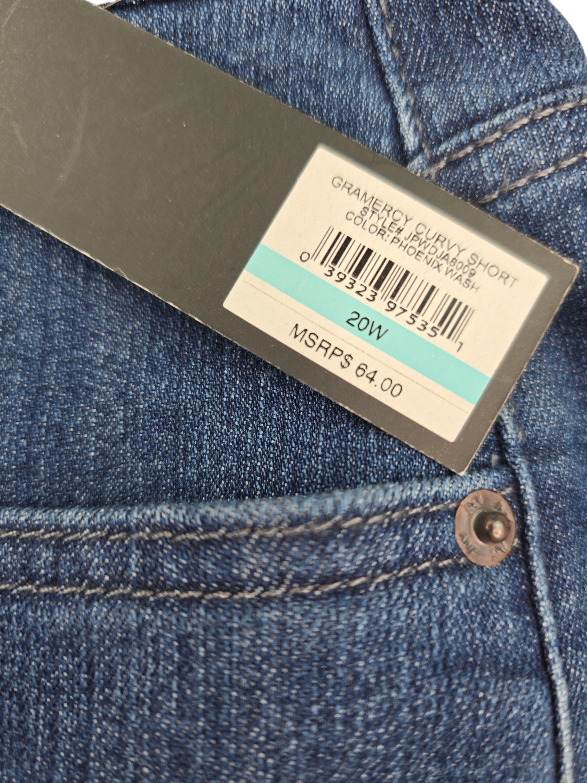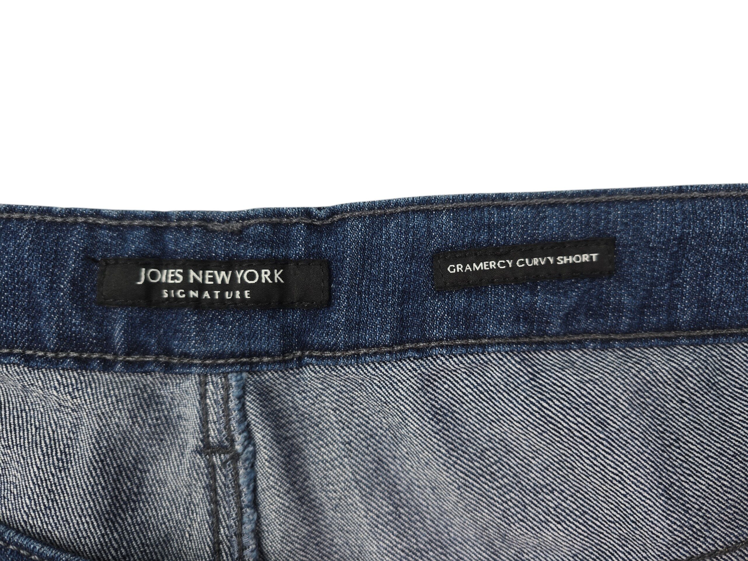 Jones New York denim shorts in size 20W, new with tags, featuring a mid-rise seat-slimming fit, tummy control panel, and stretch denim for smooth comfort. Classic blue wash with five-pocket styling and flattering pocket placement. Ships free from Curve Love Revival.
