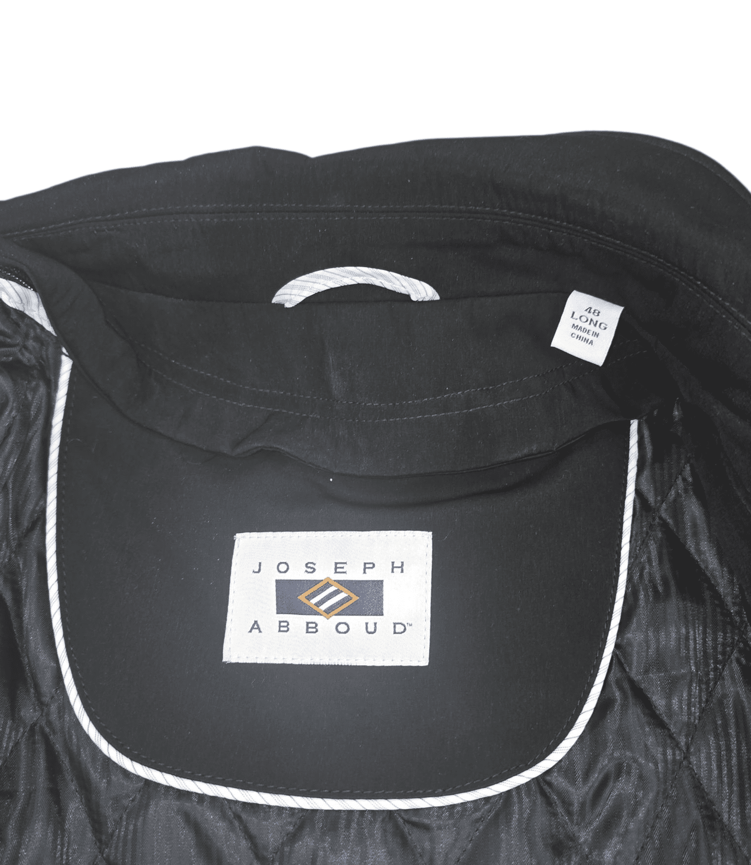 Joseph Abboud black long coat in size 48L with removable quilted lining, four-button closure, pockets inside and out, excellent condition.