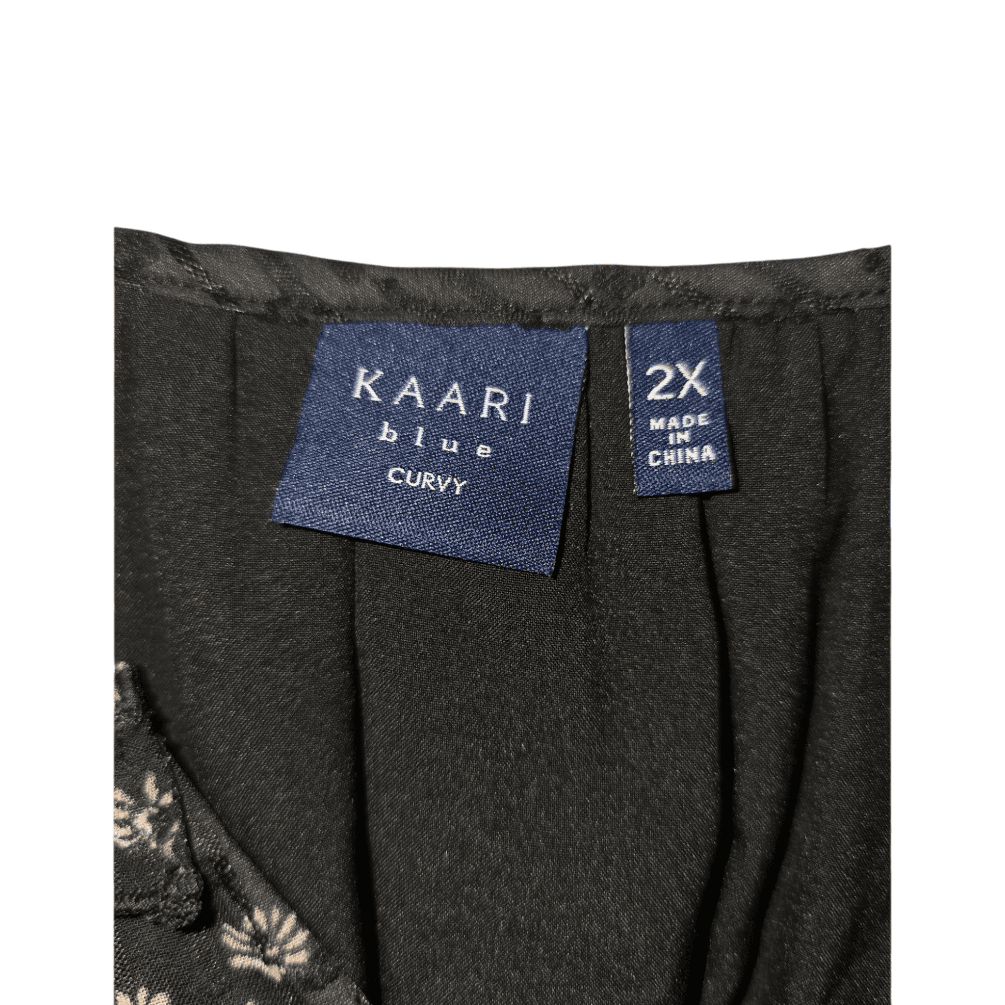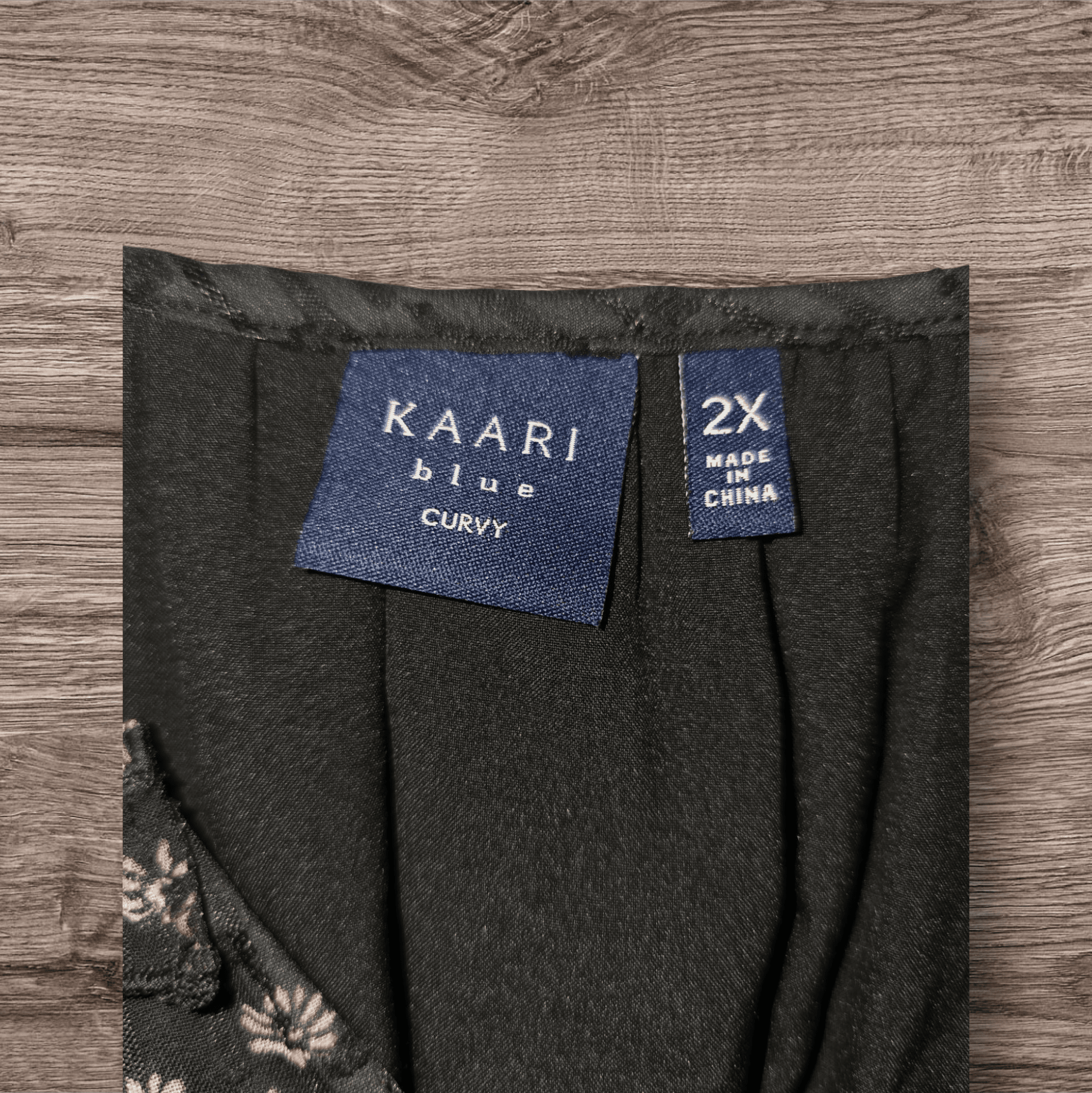Kaari Blue Curvy women’s size 2X black floral pullover with ruffled neckline and sleeves. Fully lined body, semi-sheer outer layer, and machine washable care.