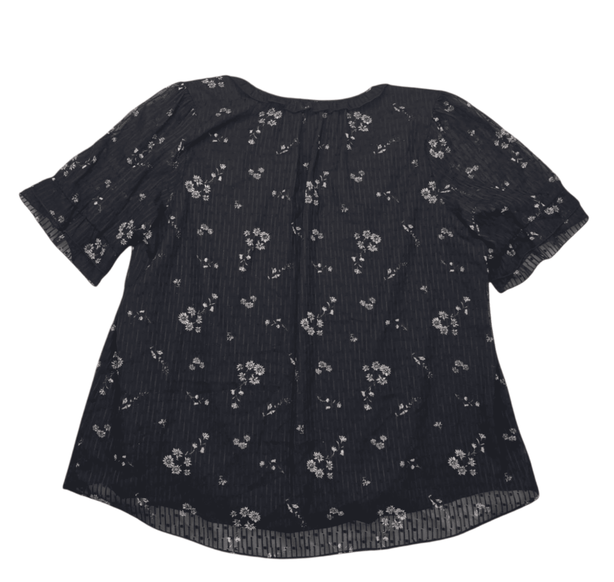 This Kaari Blue Curvy women’s pullover top in size 2X blends soft elegance with everyday ease. Styled in black with light floral accents on the front and back, it creates a look that’s feminine yet versatile. The v-neckline is framed by a delicate ruffle trim, adding texture and charm. Short sleeves with elastic ends include a double ruffle for a graceful finish.