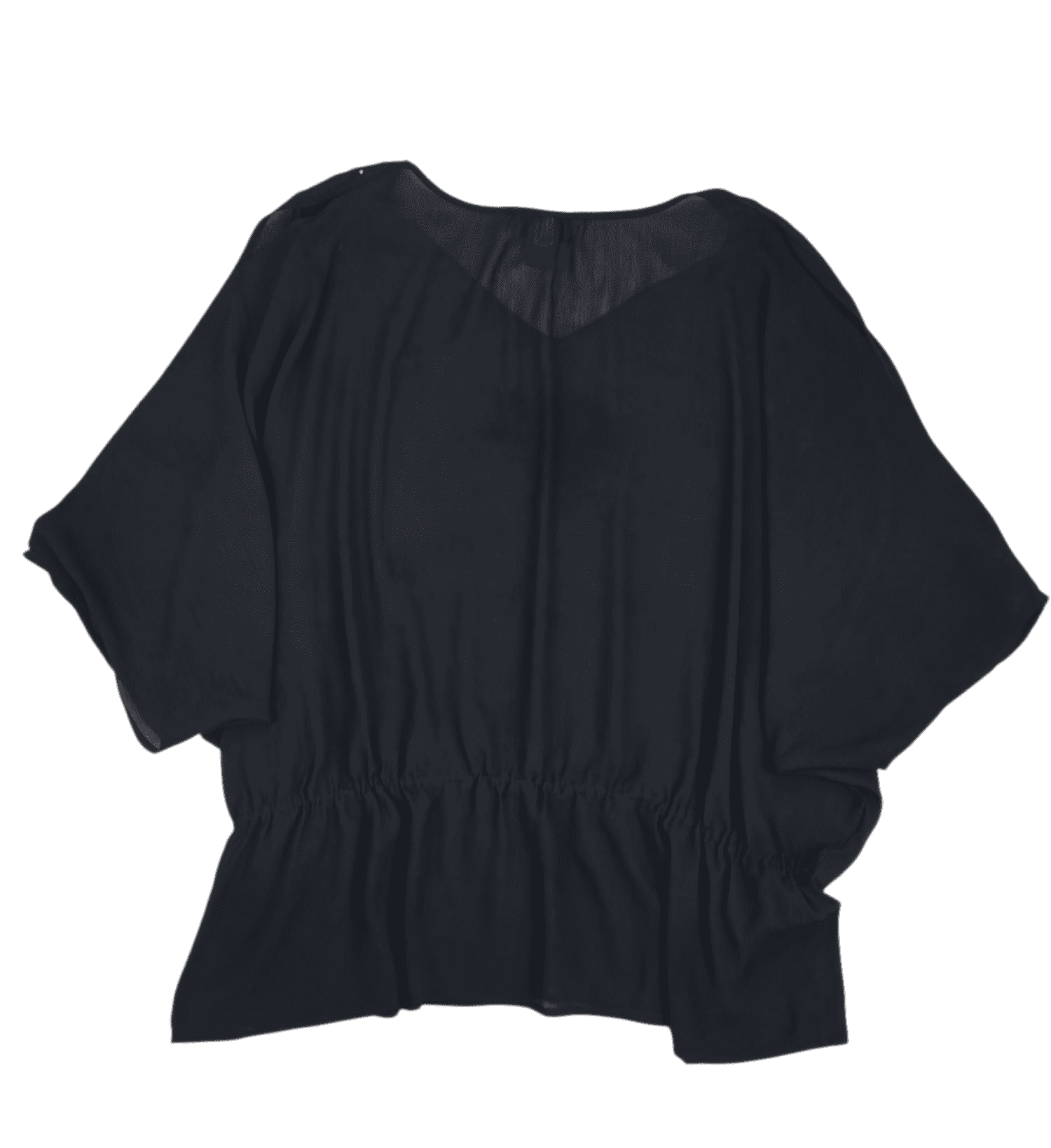 Lane Bryant women’s black pullover top with studded v-neckline, cold shoulder short sleeves, and elastic waist. Lightweight polyester, gently used condition.
