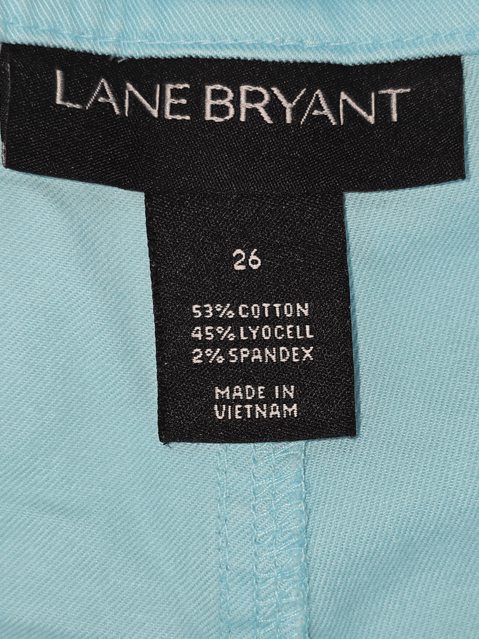 Lane Bryant women’s aqua blue stretch shorts in size 26 with secure closure, four pockets, and 12-inch inseam. Gently used.