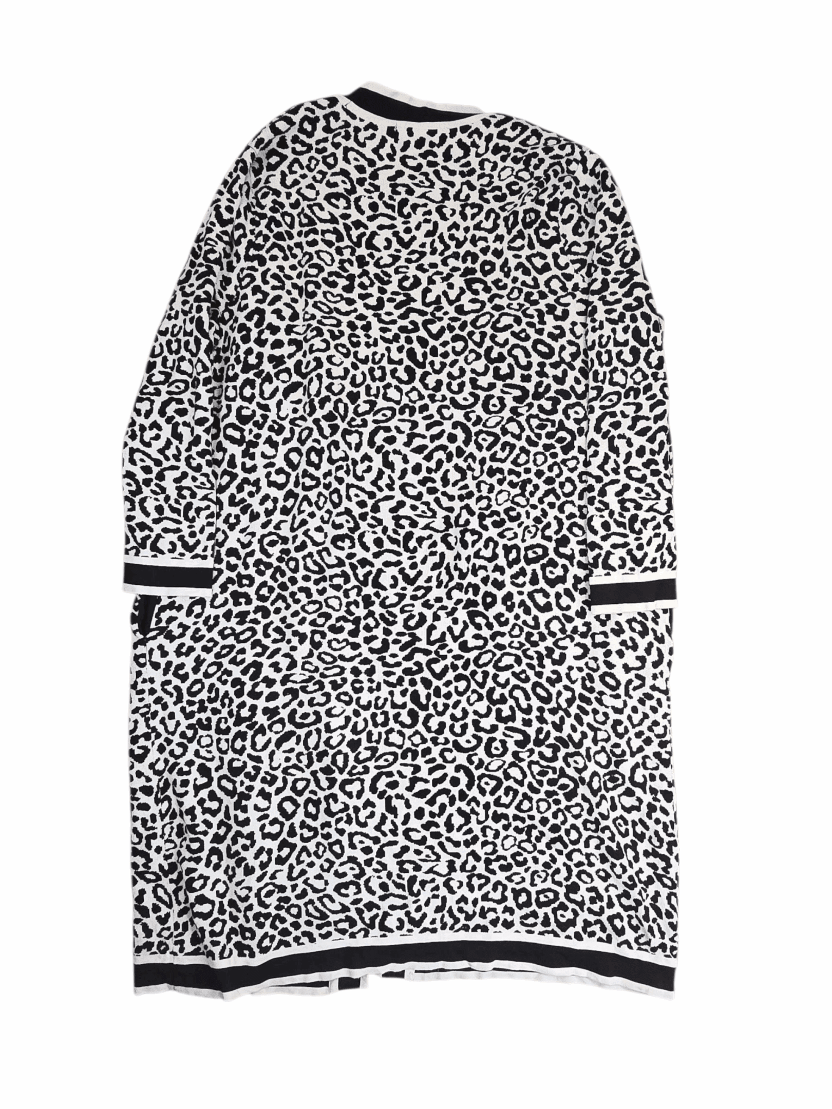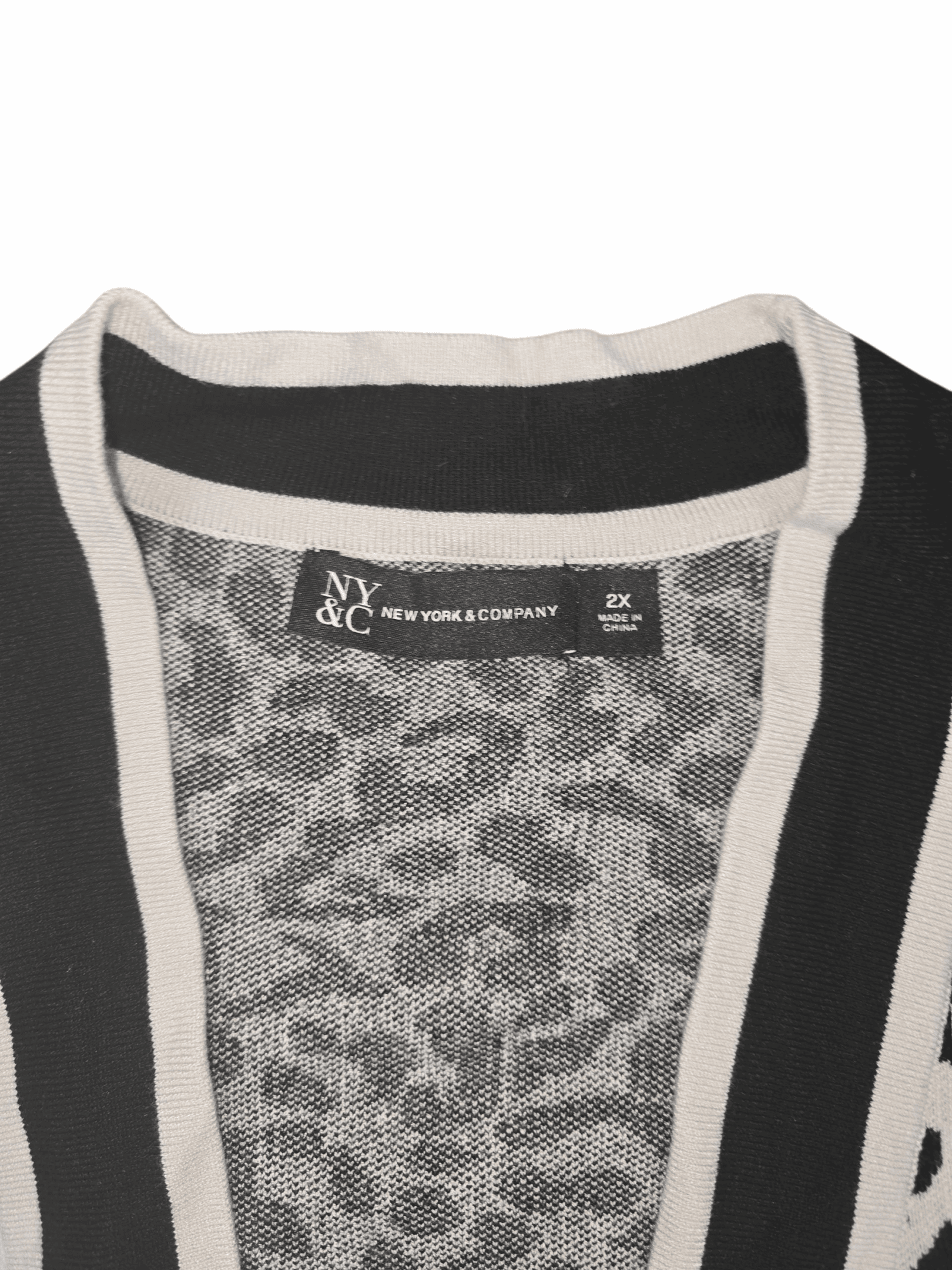 This New York & Company Women’s Plus Size 2X Duster Cardigan Sweater adds effortless style and cozy comfort to your wardrobe. Designed in an ivory base with a bold black animal print, it blends timeless elegance with modern flair. A solid ivory collar and trim run smoothly down the front, ending in a contrasting black stripe along the hem for added sophistication.