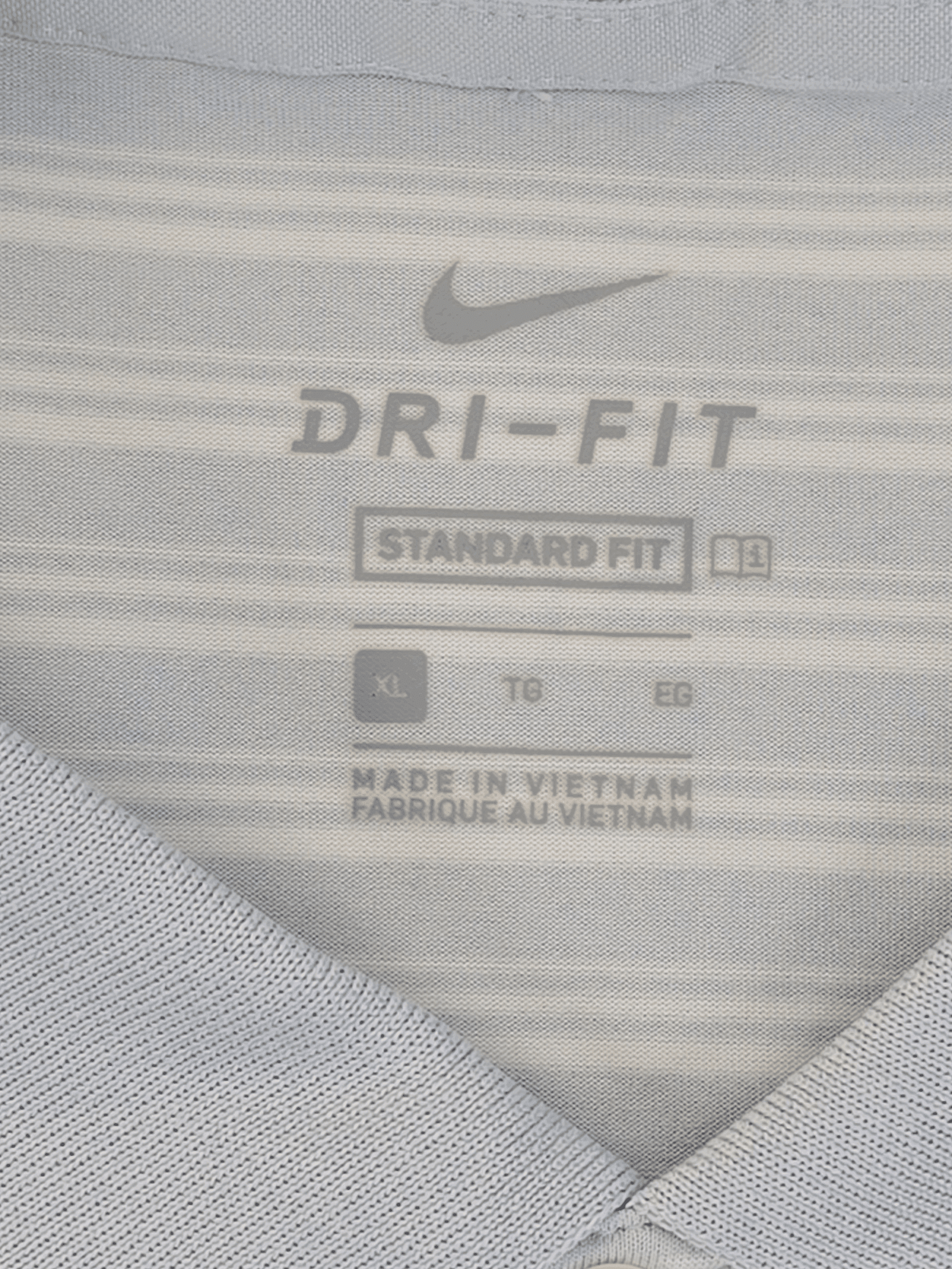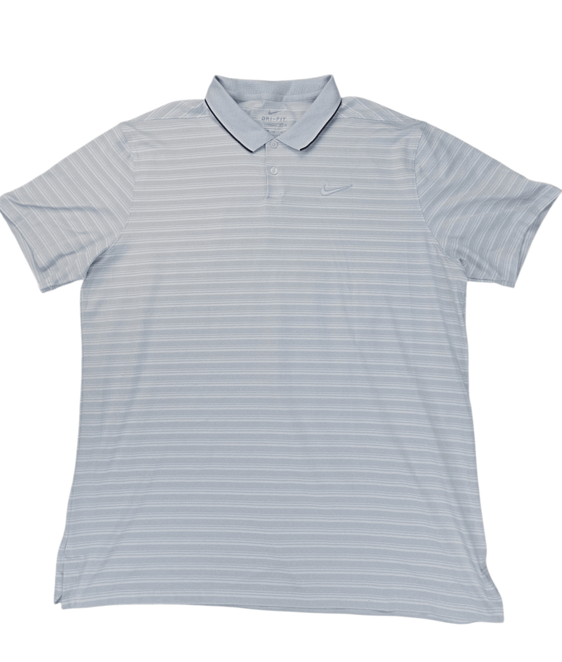Nike men’s XL Dri-FIT striped polo shirt in light gray and white with embroidered swoosh logo, quick-dry performance fabric.