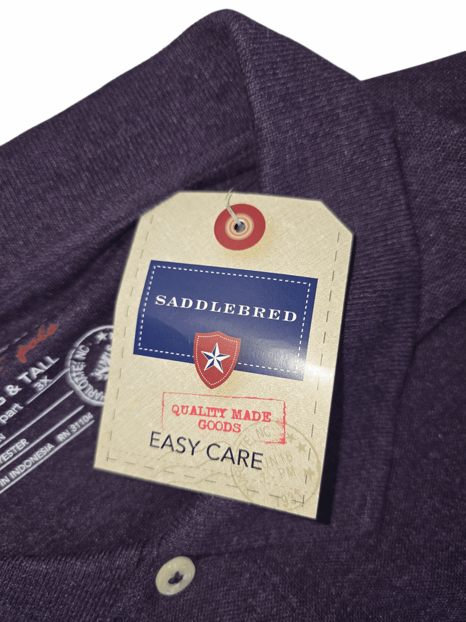 Saddlebred purple polo shirt, size 3X Big & Tall. Soft cotton-poly knit, split sides, and new with tags.