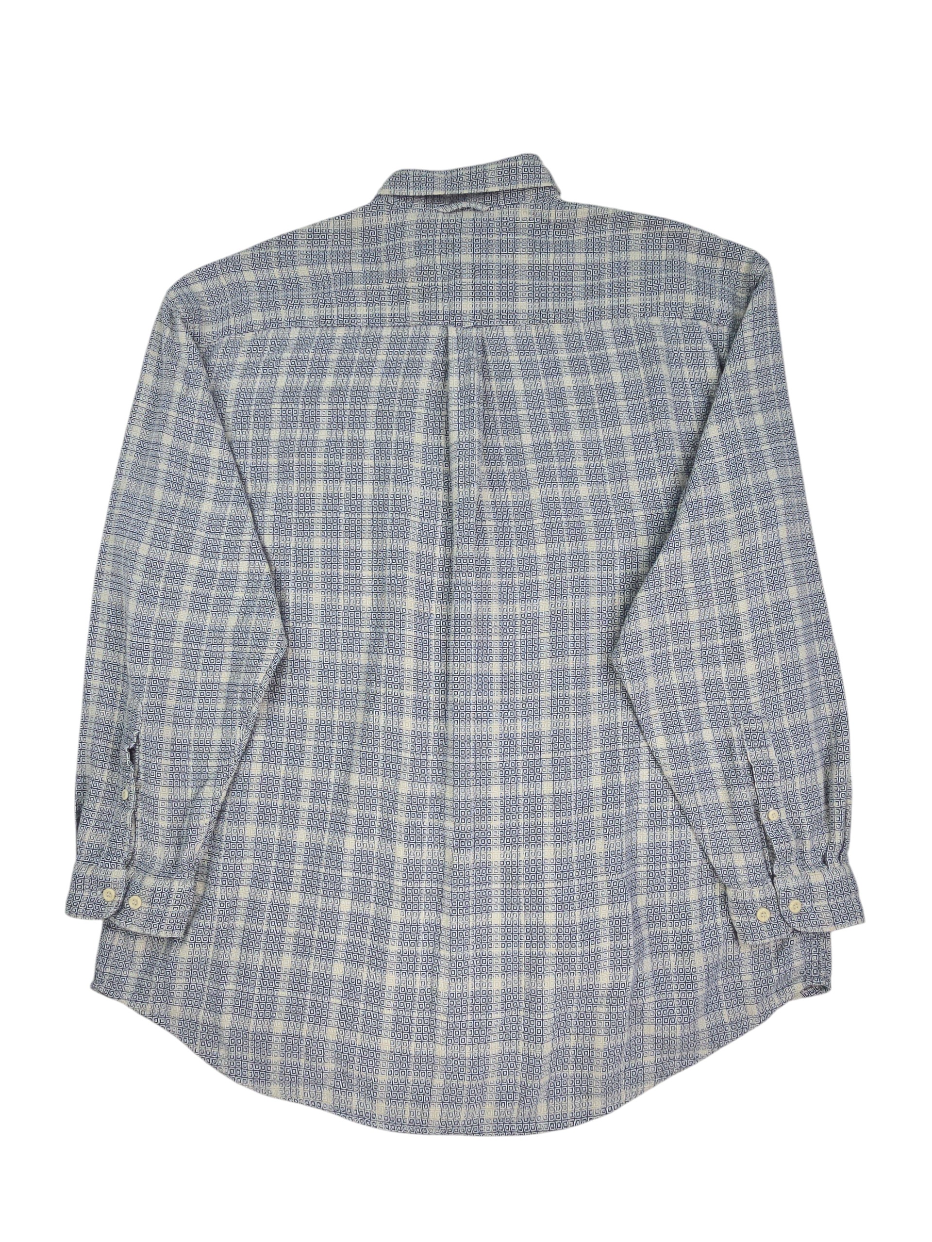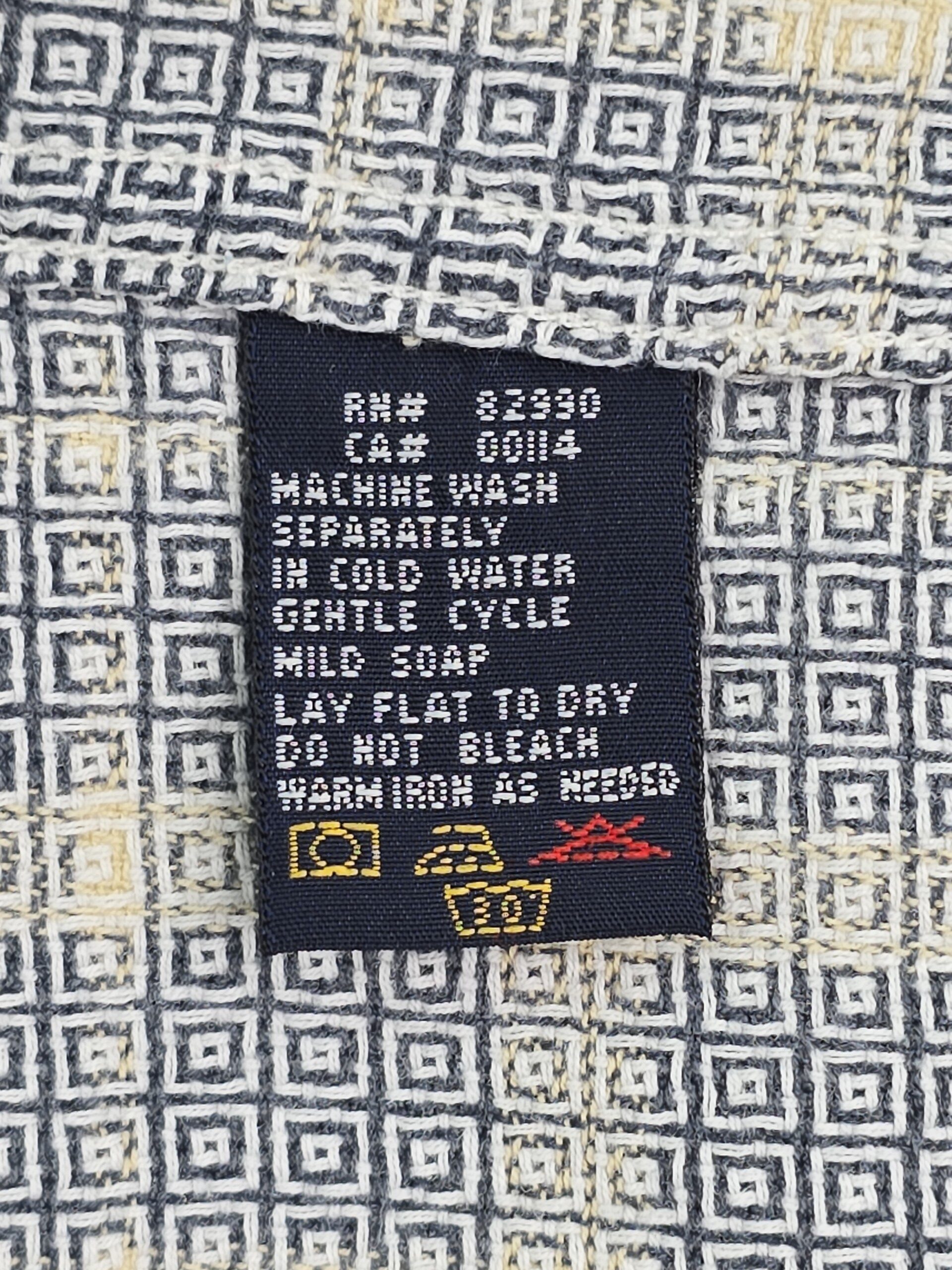 This shirt transitions easily from work to casual outings. The geometric pattern adds interest without being overpowering. The relaxed fit ensures comfort throughout the day. In good used condition with no known defects, it remains ready for continued wear. The timeless design makes it a reliable wardrobe staple.