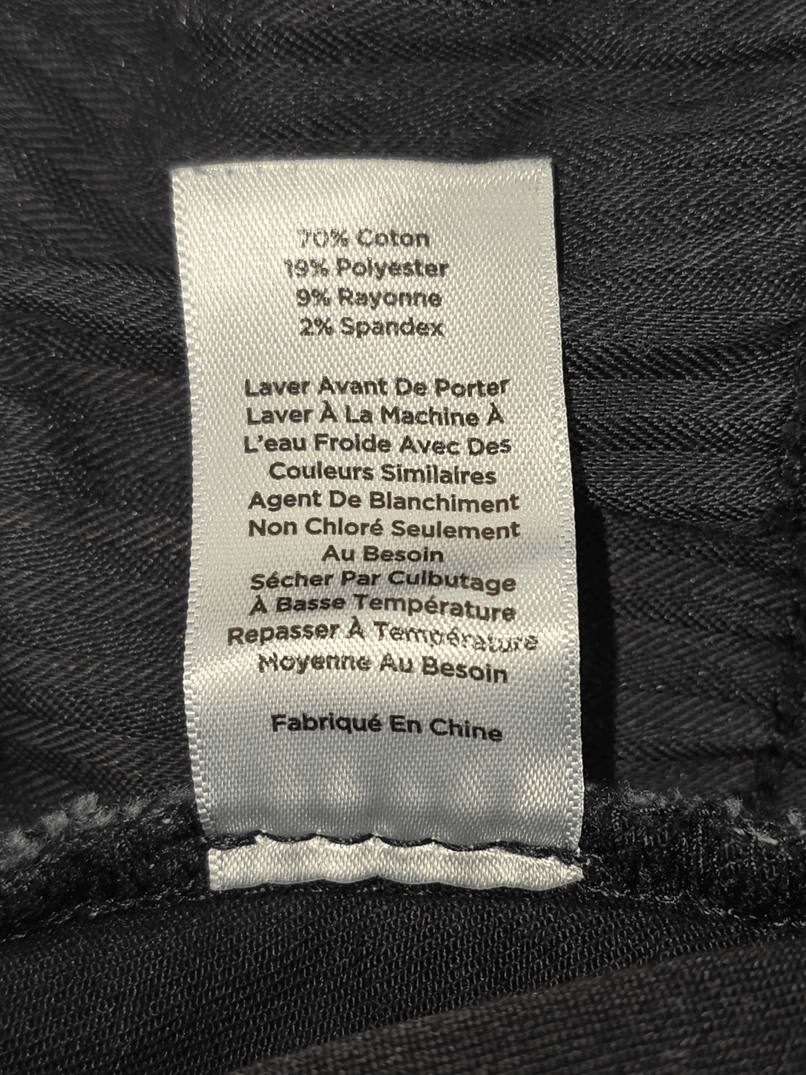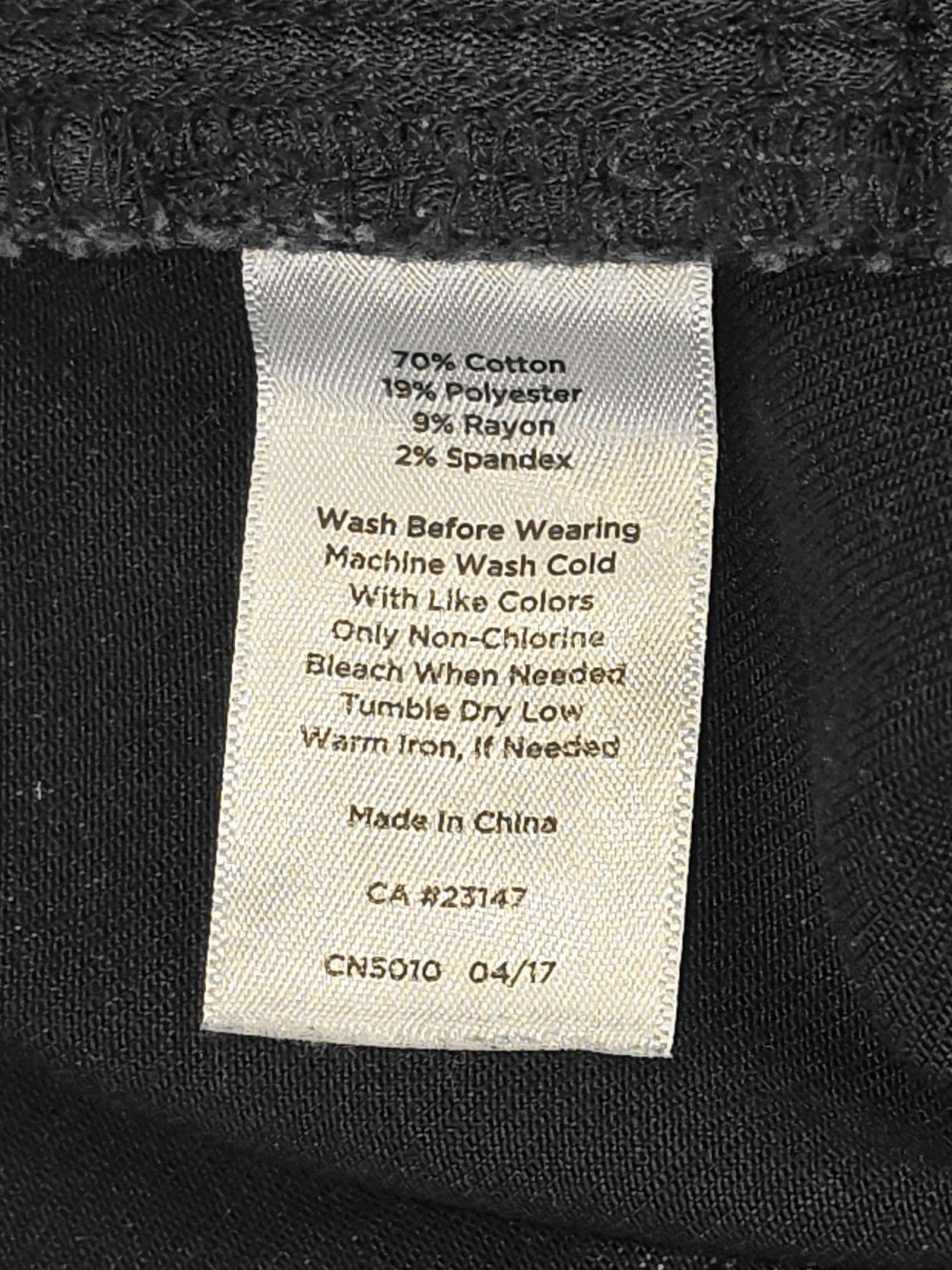 – Cotton, polyester, rayon, and spandex blend for stretch