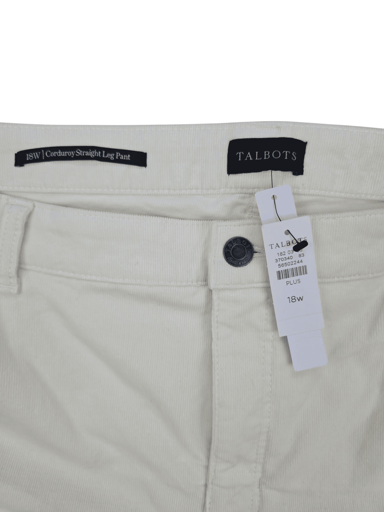 Talbots women’s size 18W ivory corduroy straight-leg pants with high waist, tummy control, and soft texture. Brand new with tags and machine washable.