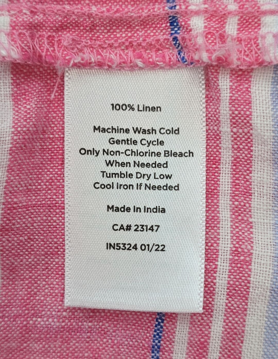 This Talbots Women’s Pink and White Linen Stripe Top brings fresh, light style to any warm-weather outfit. Made from 100% linen, it feels soft, cool, and breathable. The horizontal white stripes shift near the hips, creating visual interest and shape. Because the pullover design includes a band collar and cap sleeves, this women’s Pink and White Linen Striped Top offers a relaxed yet polished look.