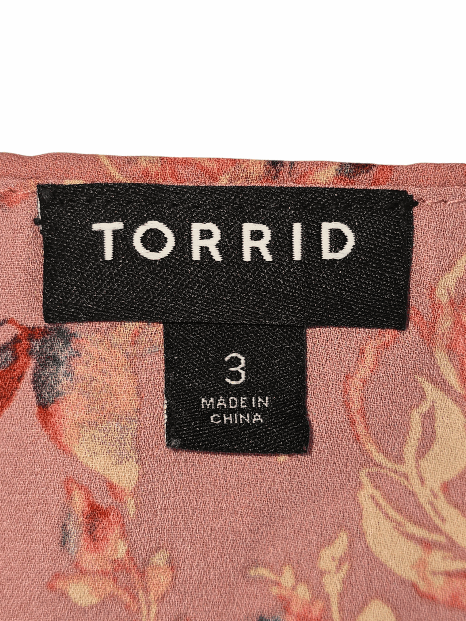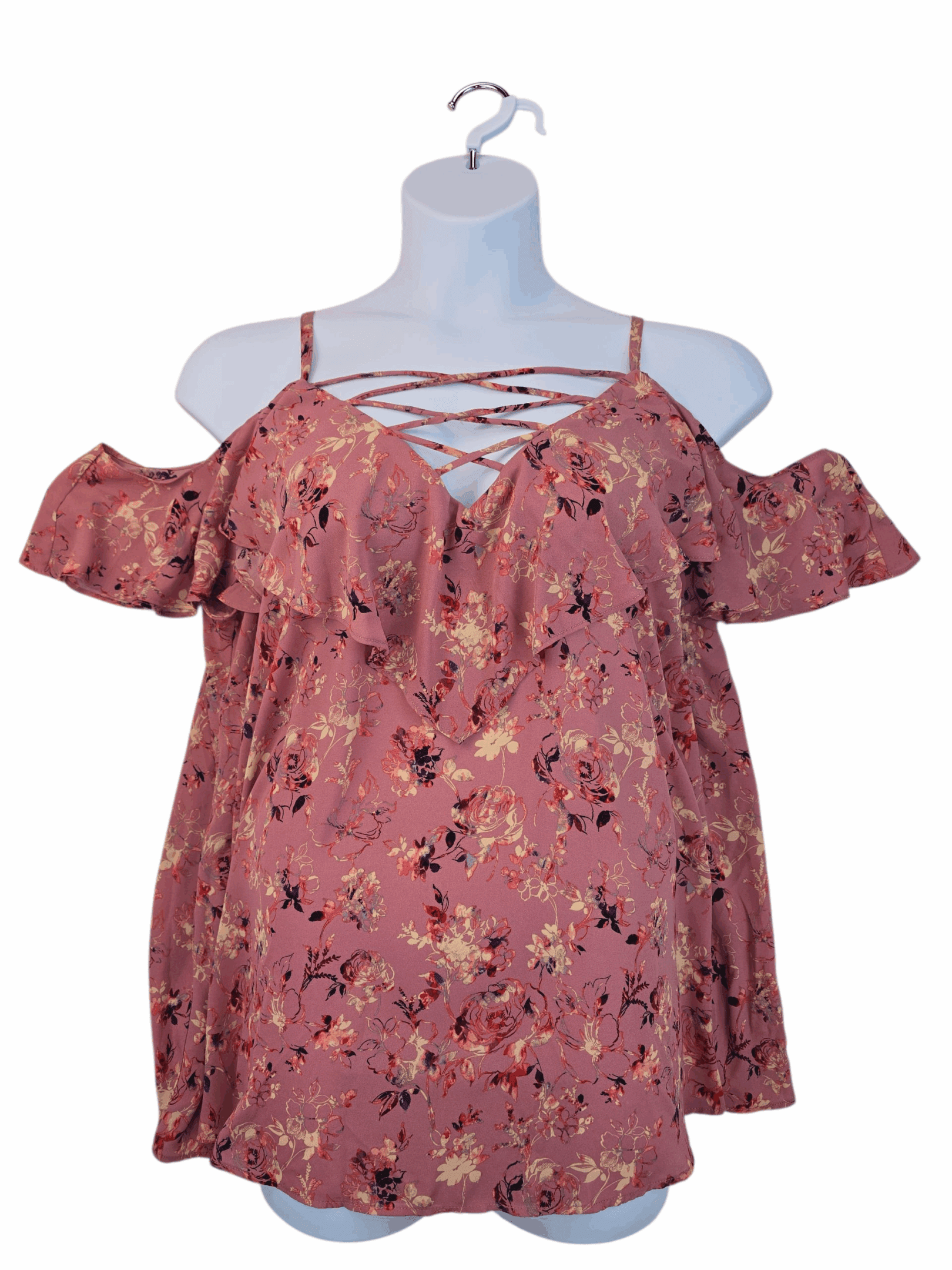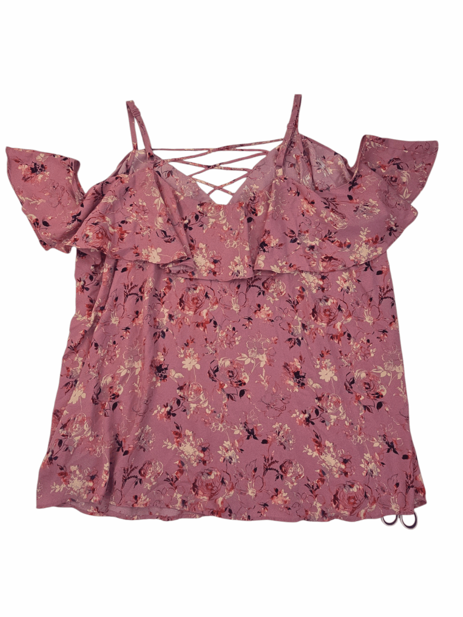 Purple Torrid off the shoulder floral top with adjustable straps, ruffle trim, and lace up neckline. Light feel, flowing shape, gently used. Always ships free from Curve Love Revival.