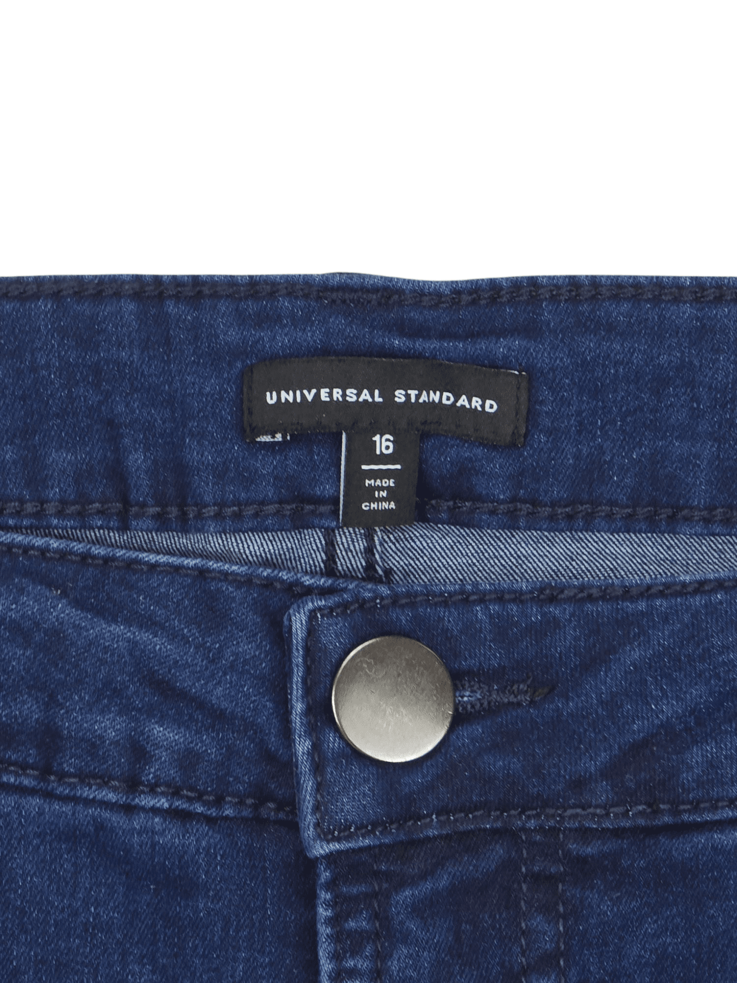 Universal Standard women’s size 16 indigo blue tapered-leg jeans with tummy control, ankle-length inseam, and five pockets.