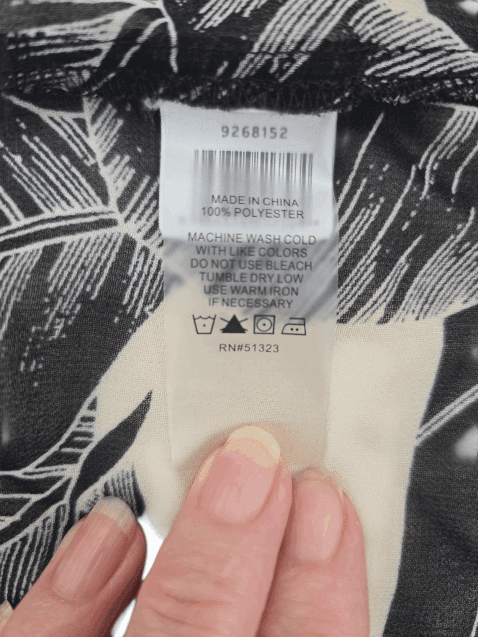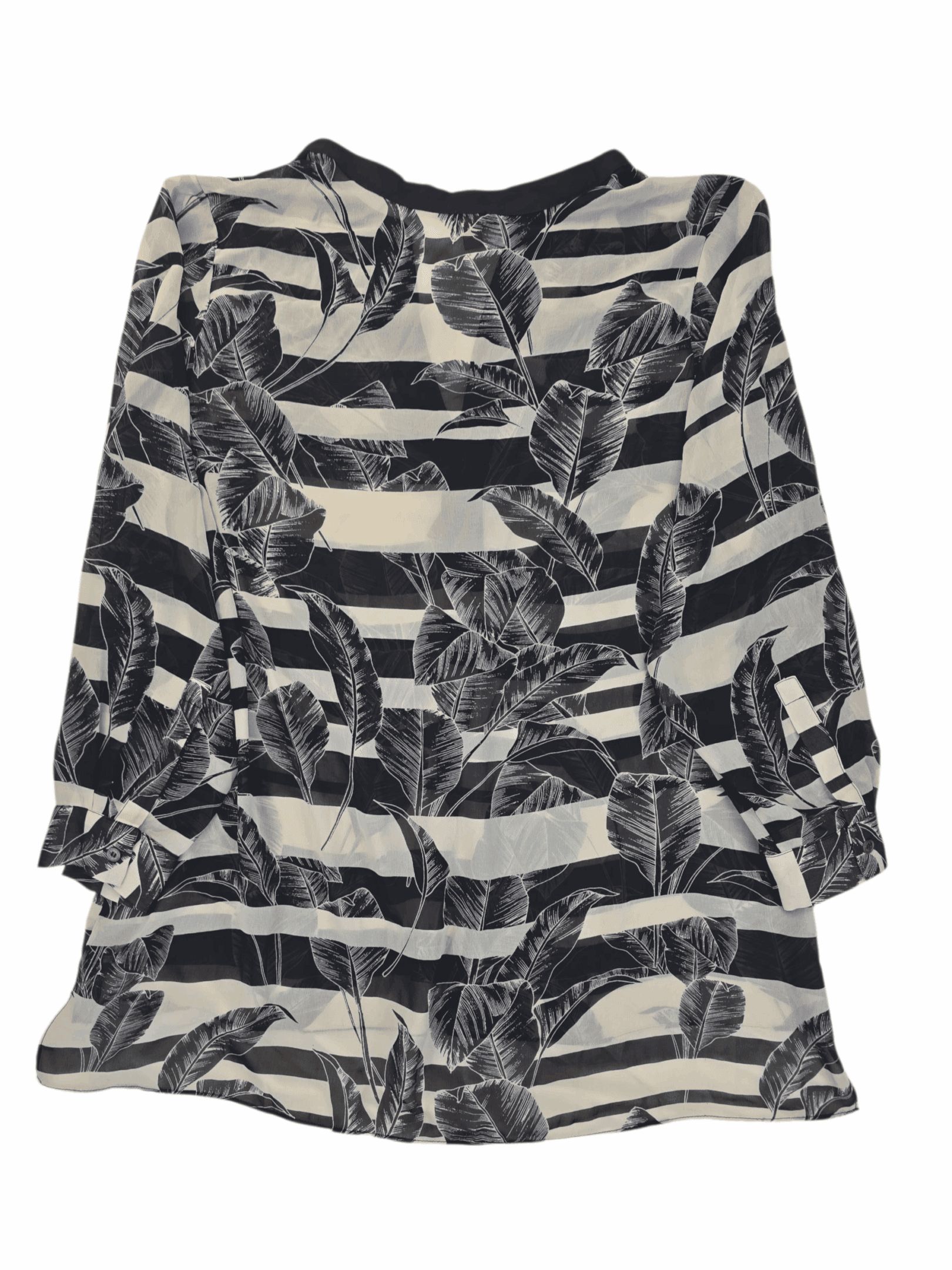 This Vince Camuto tropical leaf blouse brings bold pattern and light comfort to warm-weather outfits. It works great as a semi-sheer lightweight top for daytime events, casual dinners, and seasonal outings. The black and ivory base pattern sets a striking backdrop for layered tropical leaf accents, creating a modern mix of texture and movement. A band collar and split neckline add polish, while the partial button placket provides clean structure.