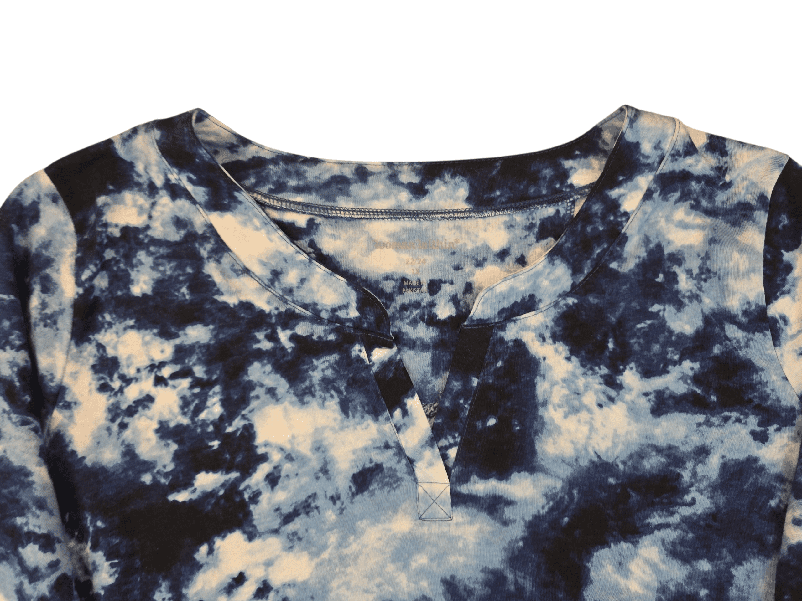 This Woman Within blue tie-dye top brings relaxed comfort and soft color for everyday wear. It also works beautifully as a blue tie-dye shirt with calming tones that feel fresh and easy to style. The V-neckline creates a flattering shape, and the 3/4 sleeves offer light coverage without feeling warm or restrictive. Split sides add movement and comfort for sitting, walking, or layering.