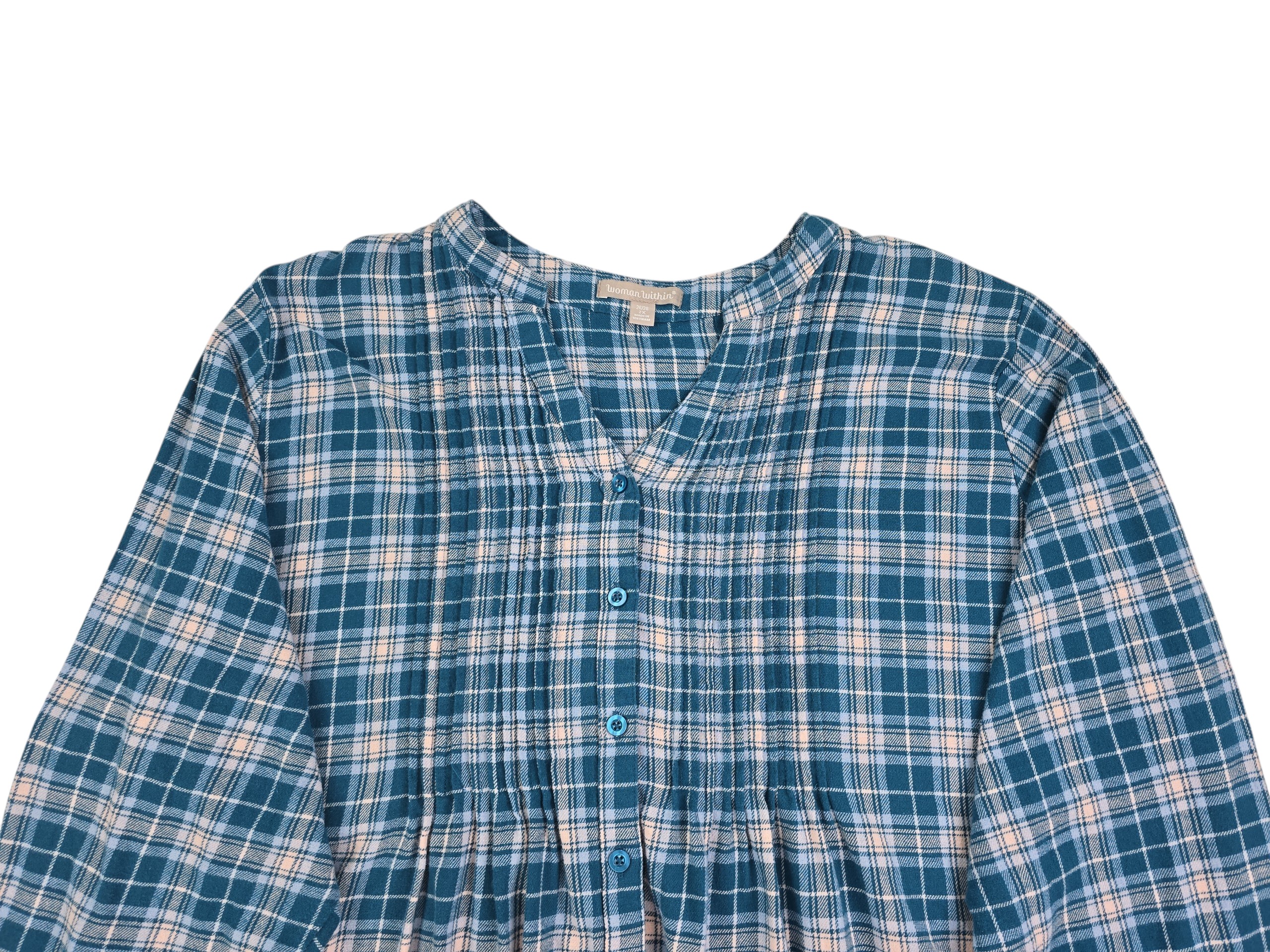 Woman Within brushed cotton blouse in size 2X with soft plaid fabric and pleated front detail. Comfortable women’s plaid cotton blouse for everyday wear. Always ships fast and free from Curve Love Revival.