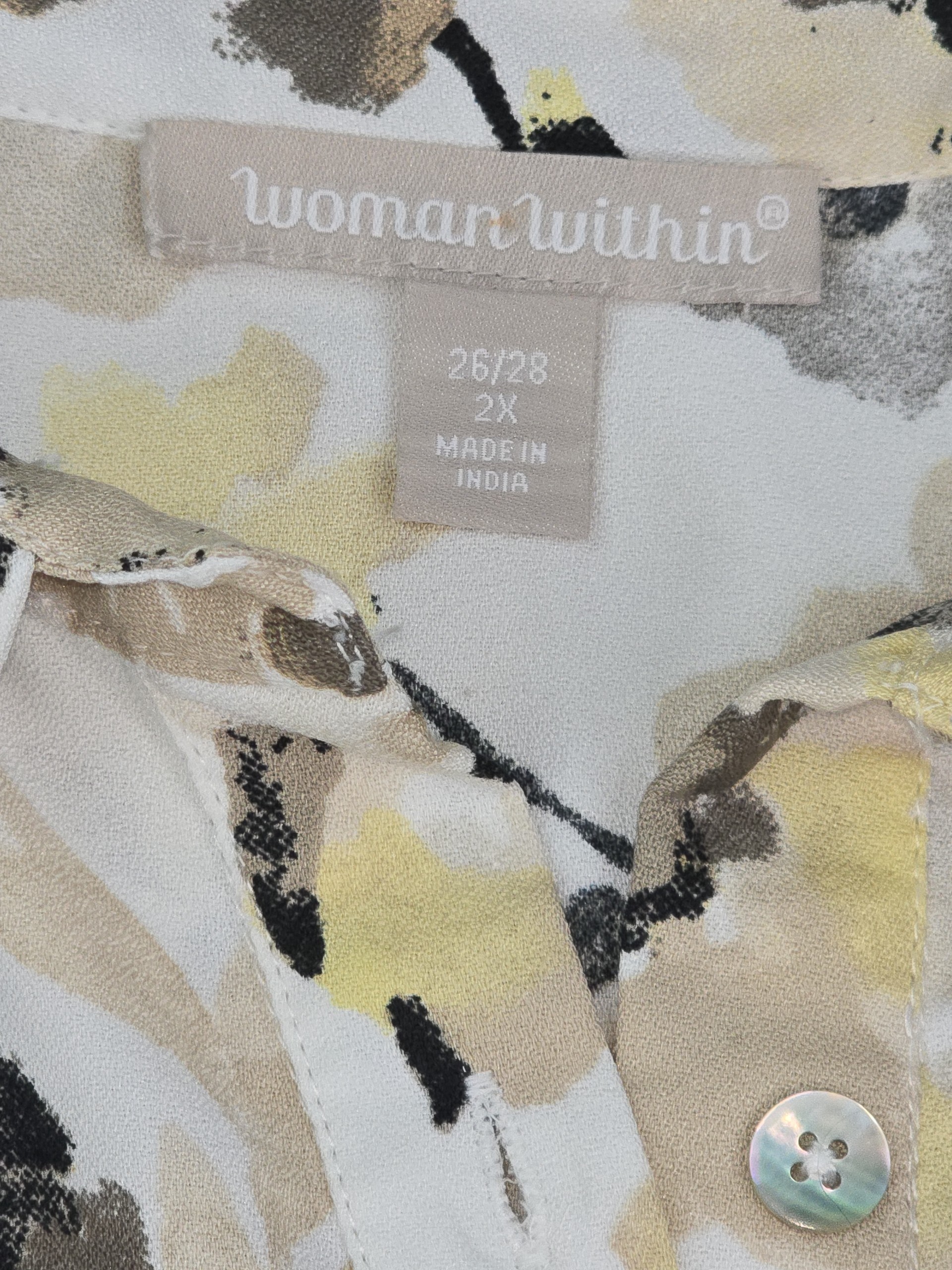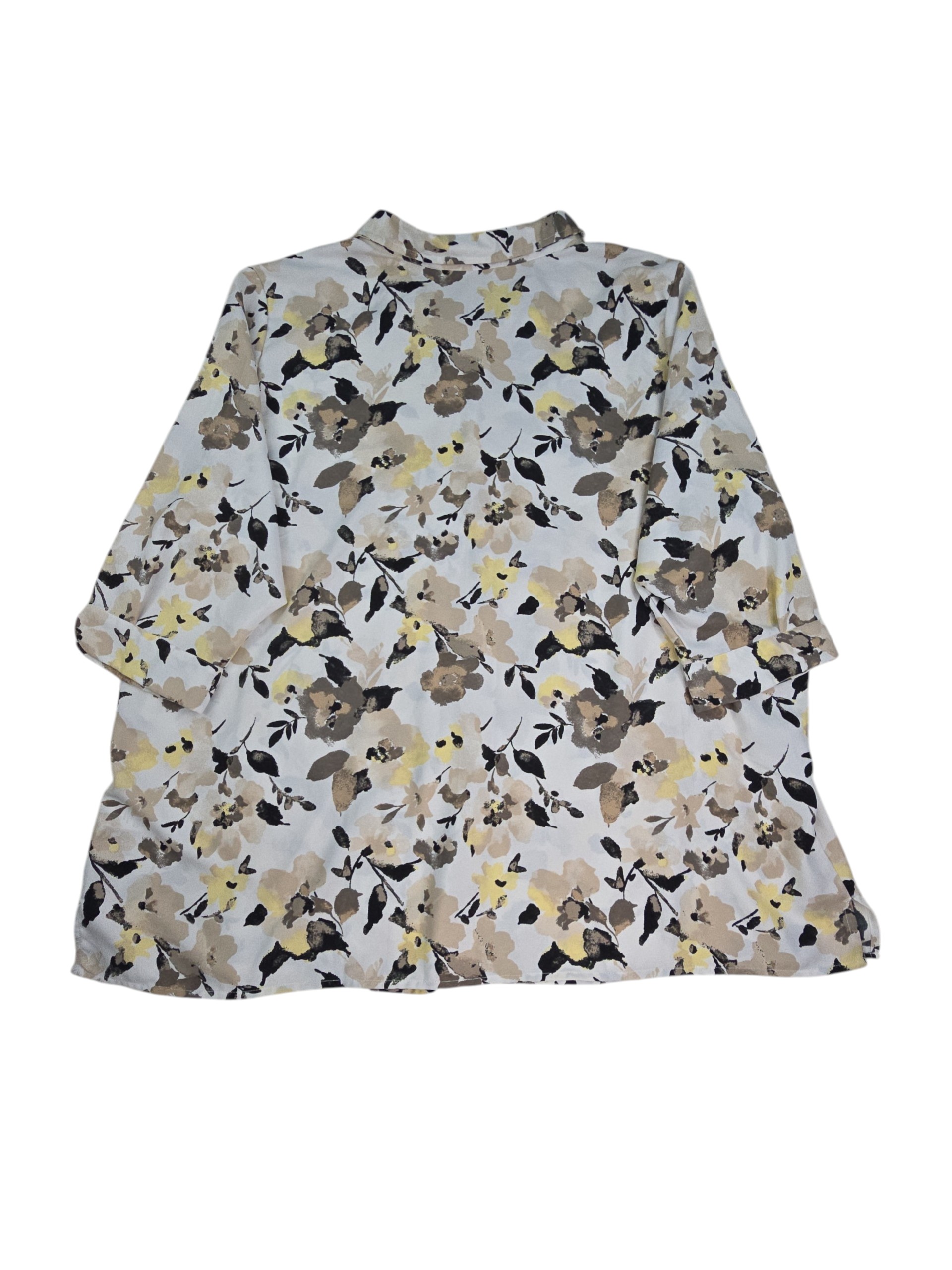 This Woman Within button up blouse in size 2X features a soft floral print in neutral tones with subtle yellow accents. This plus size floral blouse offers a lightweight feel that stays comfortable throughout the day. The relaxed fit and flowy design make it easy to pair with jeans, slacks, or skirts.