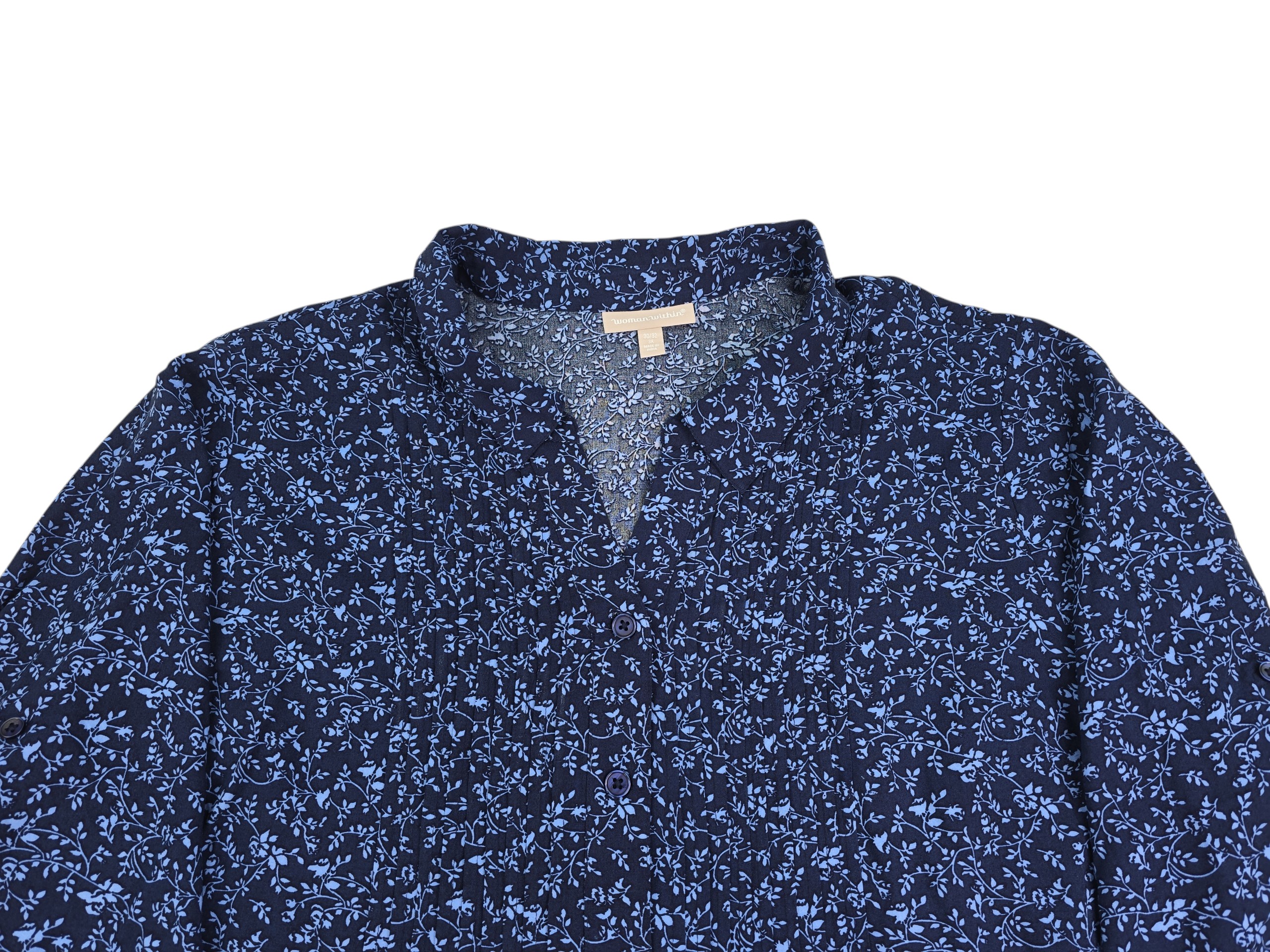 The detailed floral print in navy and blue tones adds gentle visual interest without overpowering an outfit. A partial button front with a soft collar gives the blouse classic styling. The lightweight rayon fabric helps the Woman Within blouse stay comfortable throughout the day.